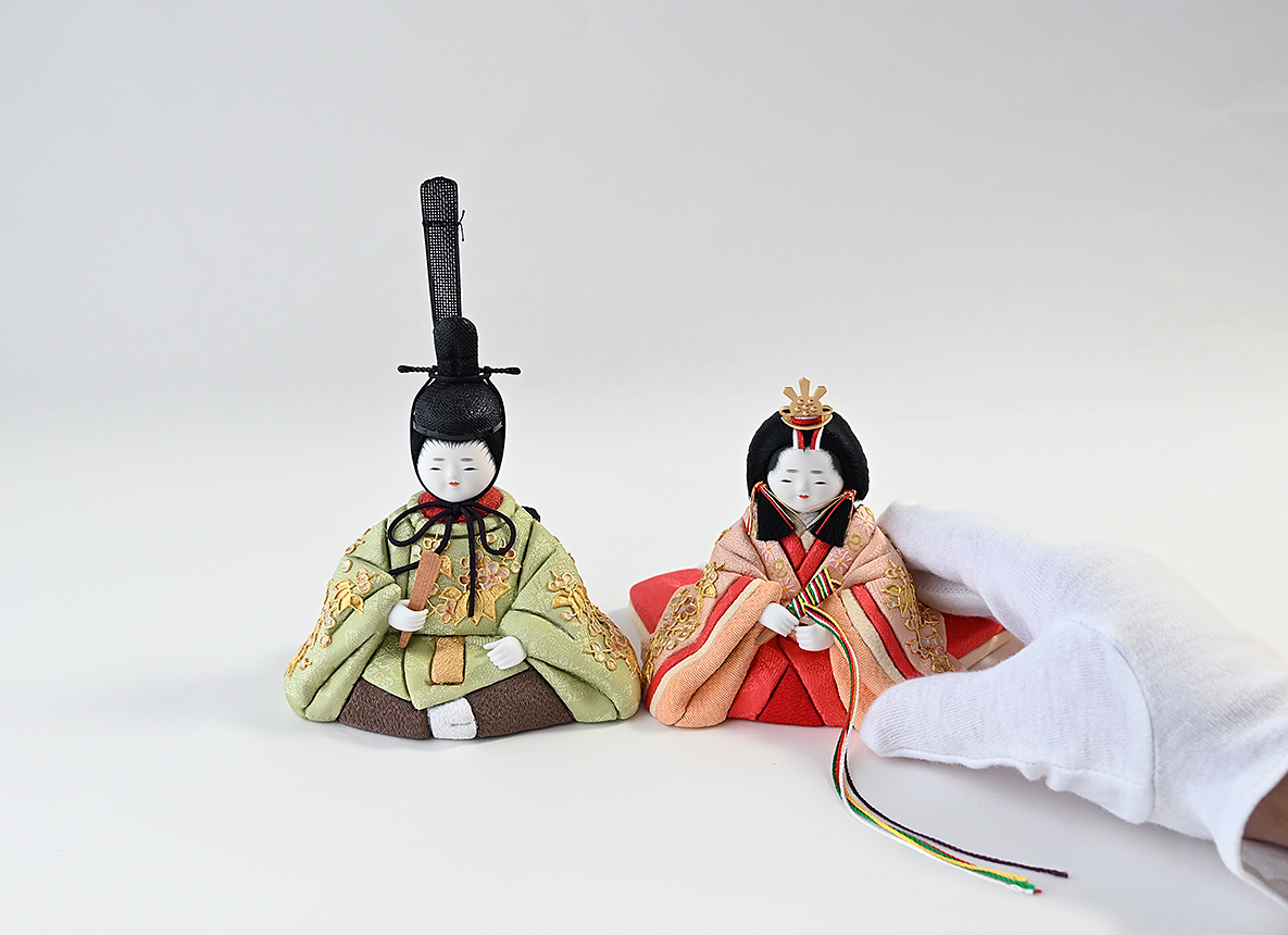 飾り台やお屏風が選べる、コンパクトで飾りやすいHINAシリーズの雛人形です。殿様・お姫様をお飾りしている台へ、一緒に三人官女まで並べられる五人飾りです。ほほえみをたたえた表情は様々な感情を呼び起こさせてくれます。赤ちゃんのもつ純真無垢な姿、また成長した上品な雰囲気をもただよわせており、これこそが五色・原孝洲の大切にする雛人形です。ふんわりと空気をまとったように贅沢に結われた髪型は、多くの絹糸を丁寧にまとめあげて仕上げており、額の生え際まで筆で丁寧に描きこむことで、特徴あるお顔がもつ優美さを引き立てます。お衣装は伝統的な美しい若草色(殿)と桜色(姫)の上に、豪華にも本金箔を使った蒔絵の技法(手描きで衣装の上から直接描く)で絵柄を施しました。春に先駆けて咲く梅と、繁栄を示す笹は取り合わせよい縁起柄として好まれます。お姫様の袖口や袴のグラデーションの美しさ、お殿様の後背部には下襲の裾(したがさねのきょ)と呼ばれる部分まで再現しており、実際に着物を召したようなお姿は、木目込み人形としての高い技術水準を示しています。殿姫同様に、お子様の行く末頼もしい成長を見守る三人官女は、雛人形の華やかでいながら厳かな味わいを豊かにします。かわいいだけでは終わらない、伝えるべき大切な日本文化の美しさをこの場へ現出させてくれます。雛人形として欠かすことのできない三人官女も私たちのこだわりです。組み立て不要の軽くて薄い平らな台と、上品なデザインの屏風でお飾りする雛人形です。末永くお飾りするお雛様。訪れる桃の節句が毎年楽しみになるような雛人形です。