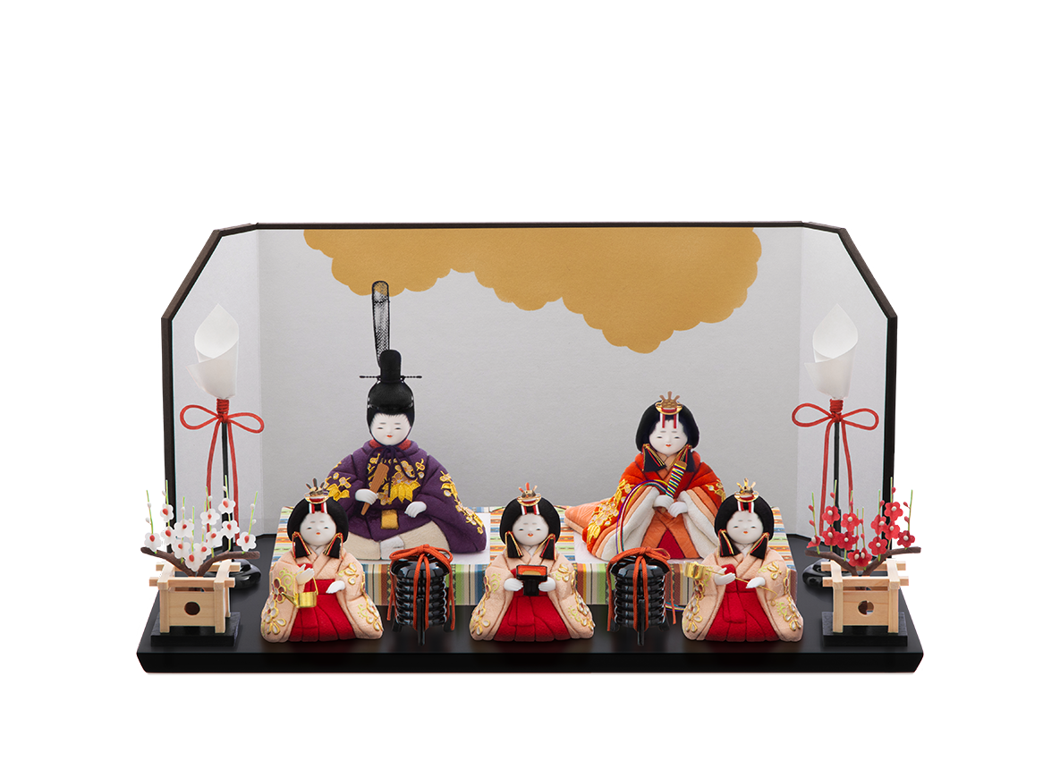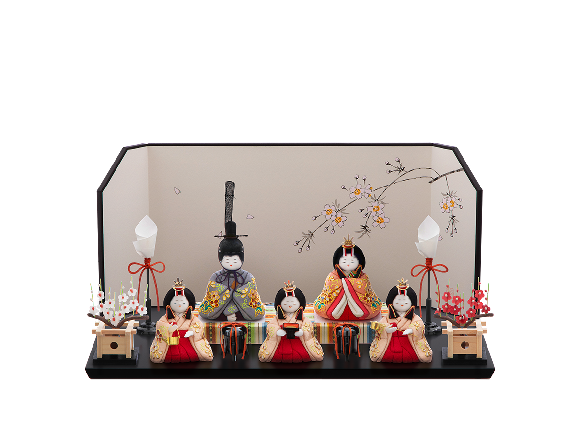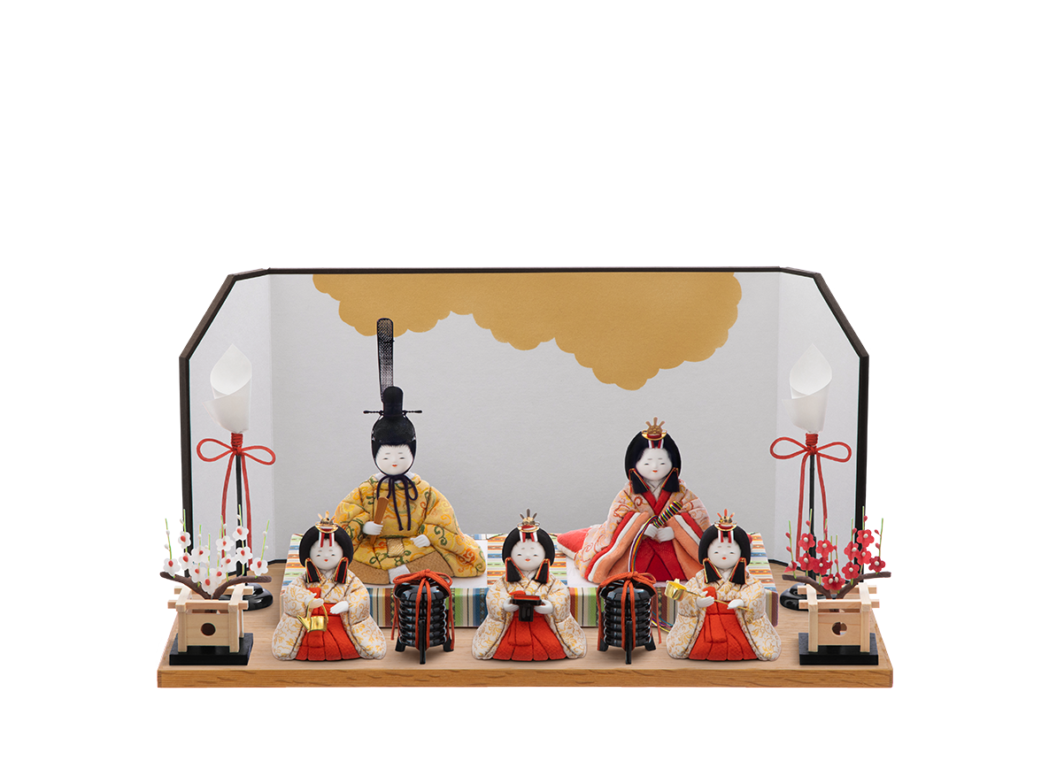 飾り台やお屏風が選べる、コンパクトで飾りやすいHINAシリーズの雛人形です。殿様・お姫様をお飾りしている台へ、一緒に三人官女まで並べられる五人飾りです。ほほえみをたたえた表情は様々な感情を呼び起こさせてくれます。赤ちゃんのもつ純真無垢な姿、また成長した上品な雰囲気をもただよわせており、これこそが五色・原孝洲の大切にする雛人形です。ふんわりと空気をまとったように贅沢に結われた髪型は、多くの絹糸を丁寧にまとめあげて仕上げており、額の生え際まで筆で丁寧に描きこむことで、特徴あるお顔がもつ優美さを引き立てます。お衣装は伝統的な美しい若草色(殿)と桜色(姫)の上に、豪華にも本金箔を使った蒔絵の技法(手描きで衣装の上から直接描く)で絵柄を施しました。春に先駆けて咲く梅と、繁栄を示す笹は取り合わせよい縁起柄として好まれます。お姫様の袖口や袴のグラデーションの美しさ、お殿様の後背部には下襲の裾(したがさねのきょ)と呼ばれる部分まで再現しており、実際に着物を召したようなお姿は、木目込み人形としての高い技術水準を示しています。殿姫同様に、お子様の行く末頼もしい成長を見守る三人官女は、雛人形の華やかでいながら厳かな味わいを豊かにします。かわいいだけでは終わらない、伝えるべき大切な日本文化の美しさをこの場へ現出させてくれます。雛人形として欠かすことのできない三人官女も私たちのこだわりです。組み立て不要の軽くて薄い平らな台と、上品なデザインの屏風でお飾りする雛人形です。末永くお飾りするお雛様。訪れる桃の節句が毎年楽しみになるような雛人形です。