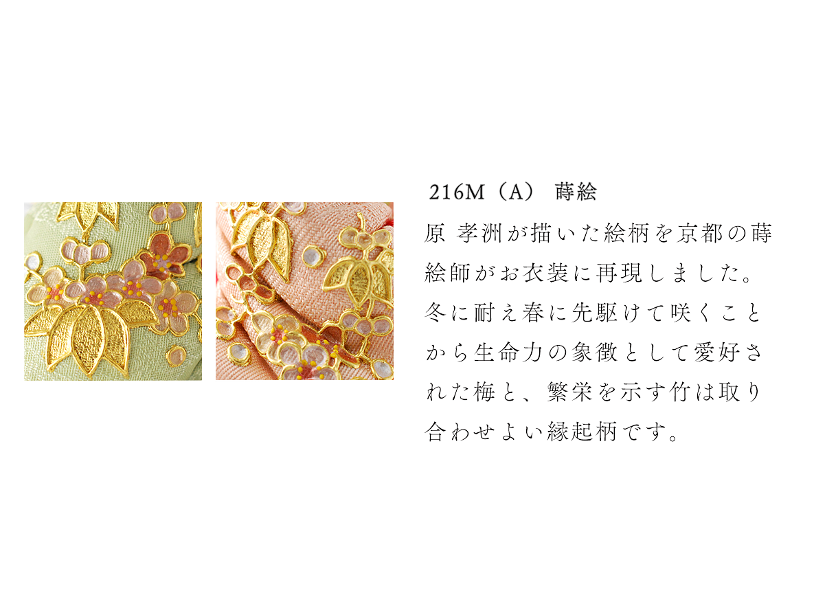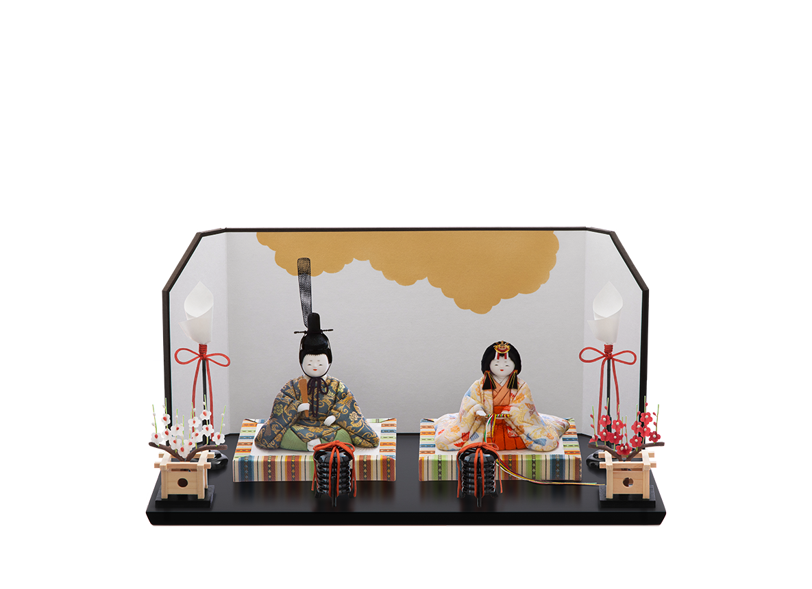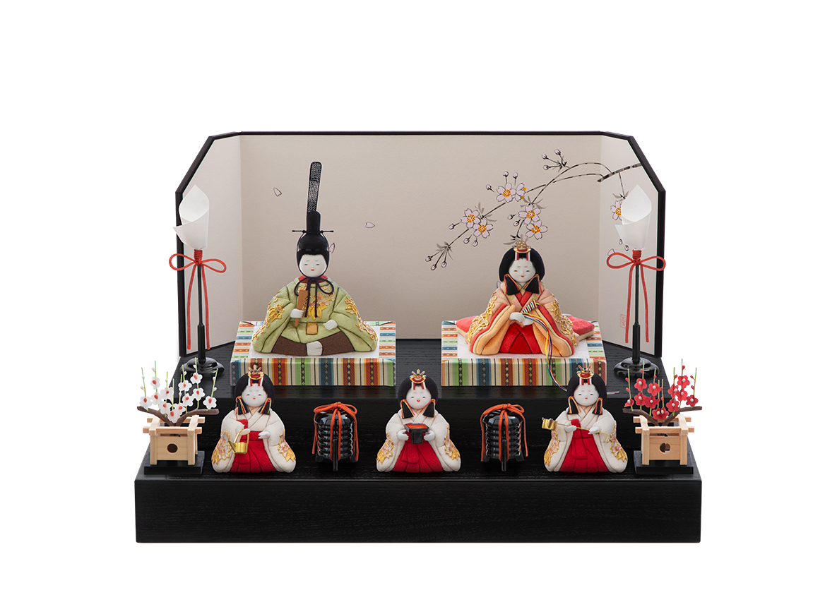 小さな壺にフェイクフラワーをたくさん飾った、華やいだ雰囲気のお雛さまセットです。ほほえみをたたえた表情は様々な感情を呼び起こさせてくれます。赤ちゃんのもつ純真無垢な姿、また成長した上品な雰囲気をもただよわせており、これこそが五色・原孝洲の大切にする雛人形です。ふんわりと空気をまとったように贅沢に結われた髪型は、多くの絹糸を丁寧にまとめあげて仕上げており、額の生え際まで筆で丁寧に描きこむことで、特徴あるお顔がもつ優美さを引き立てます。お衣装は伝統的な美しい若草色(殿)と桜色(姫)の上に、豪華にも本金箔を使った蒔絵の技法(手描きで衣装の上から直接描く)で絵柄を施しました。春に先駆けて咲く梅と、繁栄を示す笹は取り合わせよい縁起柄として好まれます。お姫様の袖口や袴のグラデーションの美しさ、お殿様の後背部には下襲の裾(したがさねのきょ)と呼ばれる部分まで再現しており、実際に着物を召したようなお姿は、木目込み人形としての高い技術水準を示しています。