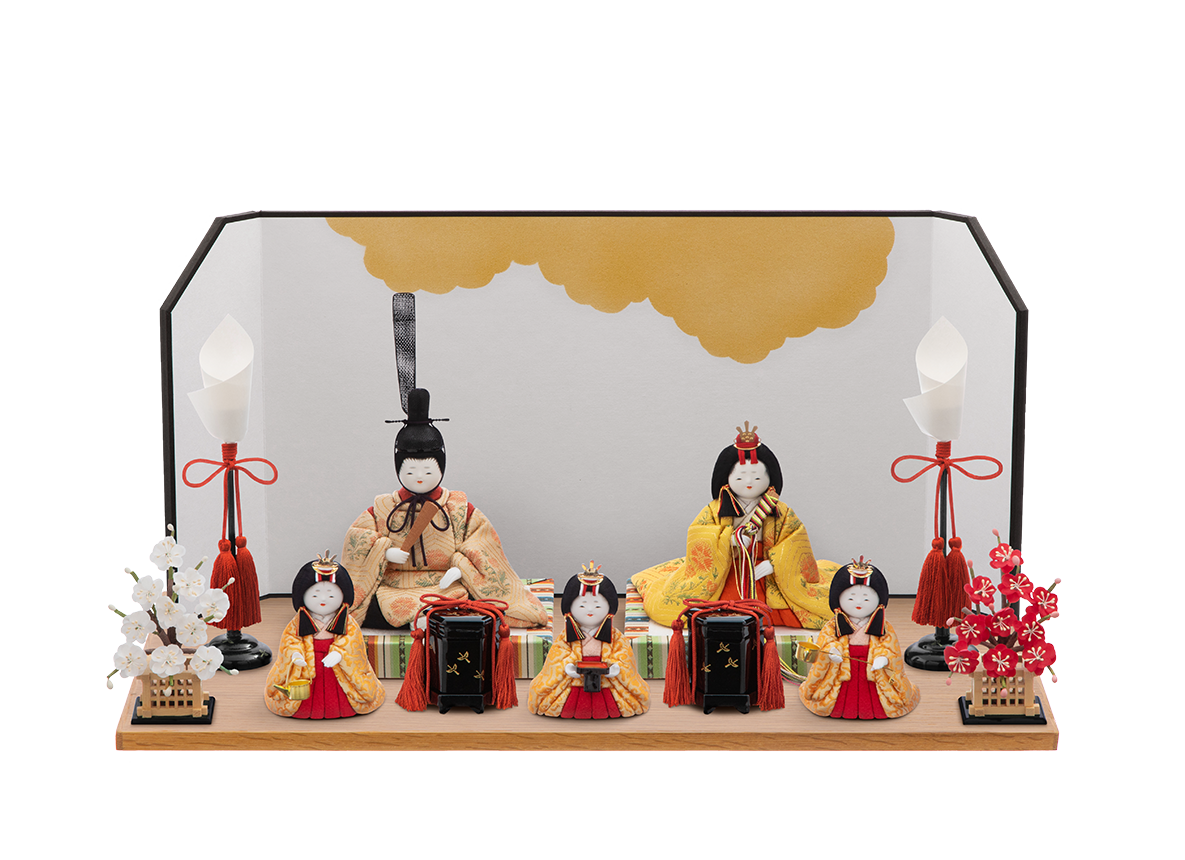【龍村】 飾り台やお屏風が選べる、コンパクトで飾りやすいHINAシリーズの雛人形です。赤ちゃんのように幼いというよりは、成長された上品なお姿で、ほほえみかけてくれているような表情にほっこりと癒やされる、愛くるしい雛人形です。こだわりぬいたお人形さんの見どころはお衣装です。高級織物・龍村裂を着せており、ツヤを含んだ上質な生地に、高位の方々が愛した、風流なナデシコのお花が可憐に浮かび上がります。体の造形は、お殿様お姫様ともに袂(たもと)の流麗さ、足を組んだ形に至るまでフォルムの端正さが、お顔とお衣装の魅力を引き立てます。空気をまとったように贅沢に結われた髪型は、多くの絹糸を丁寧にまとめあげて仕上げております。お顔、造形、お衣装、髪など木目込み人形の命とも言える要素が渾然一体となって表された至極の作品です。殿姫同様に、お子様の行く末頼もしい成長を見守る三人官女は、雛人形の華やかでいながら厳かな味わいを豊かにします。かわいいだけでは終わらない、伝えるべき大切な日本文化の美しさをこの場へ現出させてくれます。雛人形として欠かすことのできない三人官女も私たちのこだわりです。コンパクトの平らな飾り台に、すっきりとしたお屏風で飾るセットです。永くお飾りするお雛様。訪れる桃の節句が毎年楽しみになるような雛人形です。 【蒔絵】五色・原孝洲といえば蒔絵のお衣装。より一段と手をかけた豪華な蒔絵のお衣装は、贅沢にも本金箔を使い蒔絵の技法(手描きで衣装の上から直接描く)で絵柄を施しました。ひな祭りらしい伝統的な色目の藍色(殿)、桃色(姫)の上に浮かぶ、縁起良く生命力豊かに咲き誇る桜が、前後ろとあますところなく描かれております。少量生産の人気作品であり、お子様にとって一生のお守りになる特別な作品です。