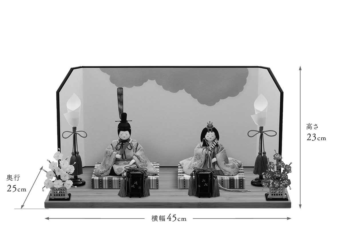 飾り台やお屏風が選べる、コンパクトシリーズの雛人形です。幼いというよりは成長された上品なお姿で、愛くるしいお人形です。お殿様お姫様ともに袂(たもと)の流麗さ、足を組んだ形に至るまでフォルムの端正さが、お顔とお衣装の魅力を引き立てます。空気をまとったように贅沢に結われた髪型は、多くの絹糸を丁寧にまとめあげて仕上げております。お顔、造形、お衣装、髪など木目込み人形の命とも言える要素が渾然一体となって表された至極の作品です。コンパクトの平らな飾り台に、すっきりとしたお屏風で飾るセットです。永くお飾りするお雛様。訪れる桃の節句が毎年楽しみになるような雛人形です。特別な作品のためお衣装は2種類ご用意しております。
