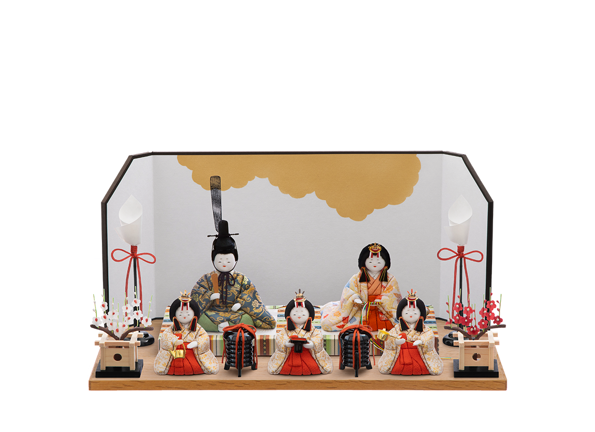 飾り台やお屏風が選べる、コンパクトシリーズの雛人形です。下ほほがふくらみを帯びたお顔だちは、純真無垢で麗しい赤ちゃんの一面と、成長の末、気品あふれる姿となるお子様の未来の姿が込められています。見ているこちらが思わずほほえんでしまうお顔は、五色・原孝洲特有の愛らしさです。お人形の命とも言える髪は、上質な絹糸を丁寧に結い上げ、ふっくらと空気をまとった姿に見応えがあります。体の造形は、お殿様の袂(たもと)のひだの表現、後背部には下襲の裾(したがさねのきょ)と呼ばれる部分まで再現しております。お姫さまもひだの表現や、後背部の裳袴(もばかま)と呼ばれる部分まで美しく作り込まれ、実際に着物を着重ねたようなお姿は、木目込み人形の水準の高さを示します。お衣装は2種類のご用意。コンパクトで平らな飾り台に、爽やかな屏風をのせてお飾りする、上品でおしゃれな雛人形です。