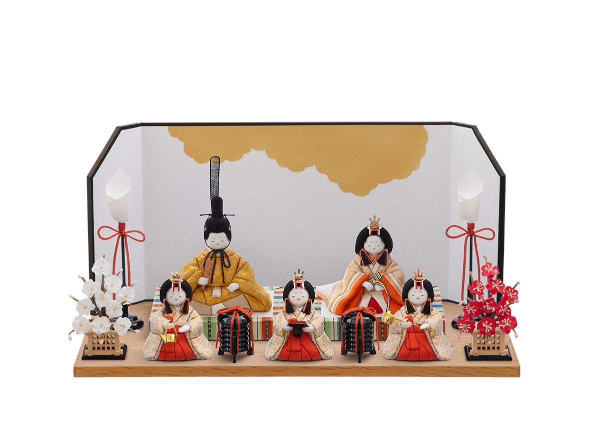 【龍村】 飾り台やお屏風が選べる、コンパクトで飾りやすいHINAシリーズの雛人形です。下ほほがふくらみを帯びたお顔だちは、いとけなくも純真無垢で麗しい赤ちゃんの一面と、成長の末、気品あふれる姿となるお子様の未来の姿が込められています。見ているこちらが思わずほほえんでしまうお顔は、五色・原孝洲特有の愛らしさです。お人形の命とも言える髪は、上質な絹糸を丁寧に結い上げ、ふっくらと空気をまとった姿に見応えがあります。上品なお顔だちに合わせ、お衣装も一段とこだわりました。お衣装には極上織物・龍村裂のお着物を着せつけました。遠き奈良〜平安時代にシルクロードから日本へ伝わった、ペルシャ風の草花模様をイメージさせる格調高い柄が、ツヤを含んだ上質な生地に浮かびあがります。体の造形は、お殿様の袂(たもと)のひだの表現、後背部には下襲の裾(したがさねのきょ)と呼ばれる部分まで再現しております。お姫さまもひだの表現や、後背部の裳袴(もばかま)と呼ばれる部分まで美しく作り込まれ、実際に着物を着重ねたようなお姿は、木目込み人形の水準の高さを示します。殿姫同様に、お子様の行く末頼もしい成長を見守る三人官女は、雛人形の華やかでいながら厳かな味わいを豊かにします。かわいいだけでは終わらない、伝えるべき大切な日本文化の美しさをこの場へ現出させてくれます。雛人形として欠かすことのできない三人官女も私たちのこだわりです。コンパクトな平らな飾り台に、すっきりとしたデザインの屏風をのせてお飾りする、上品でおしゃれな雛人形です。【蒔絵】 豪華な蒔絵のお衣装です。伝統的な美しい花浅葱色(殿)と茜色(姫)の上に、贅沢にも本金箔を使った蒔絵の技法(手描きで衣装の上から直接描く)で絵柄を施しました。草花図としての桜・橘・萩がお衣装の色彩と相まって鮮やかに浮かびます。細かな柄なので少量製作となりますが、その技の確かさから多くの方から人気の作品です。繊細美を極めた伝統的な味わいをお楽しみください。