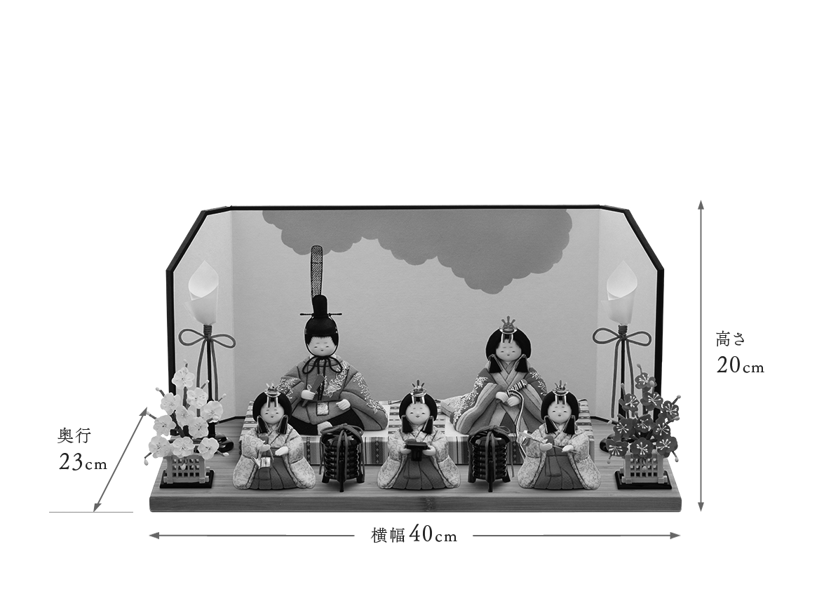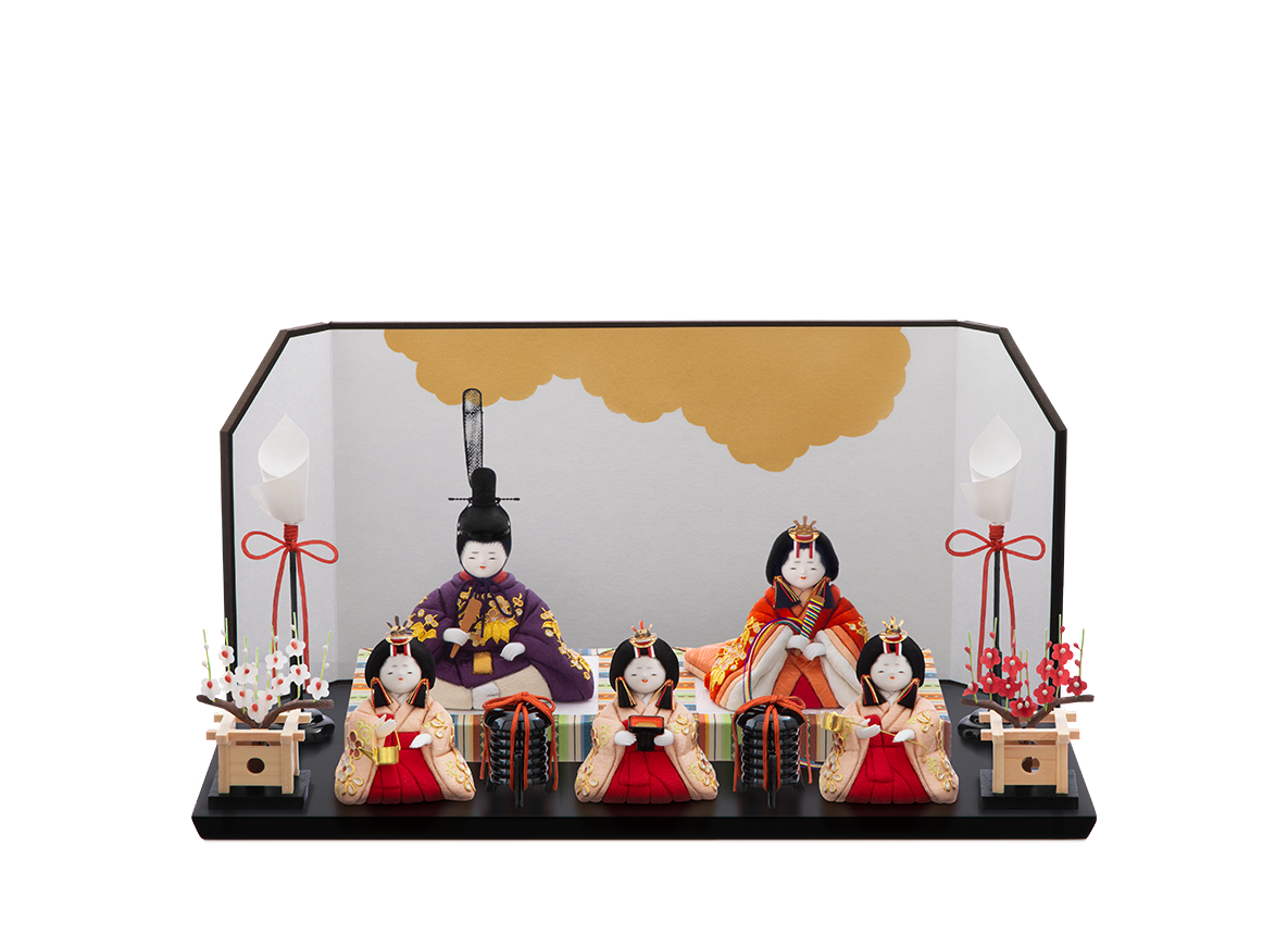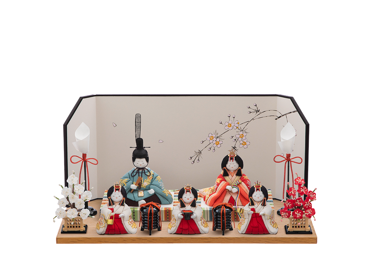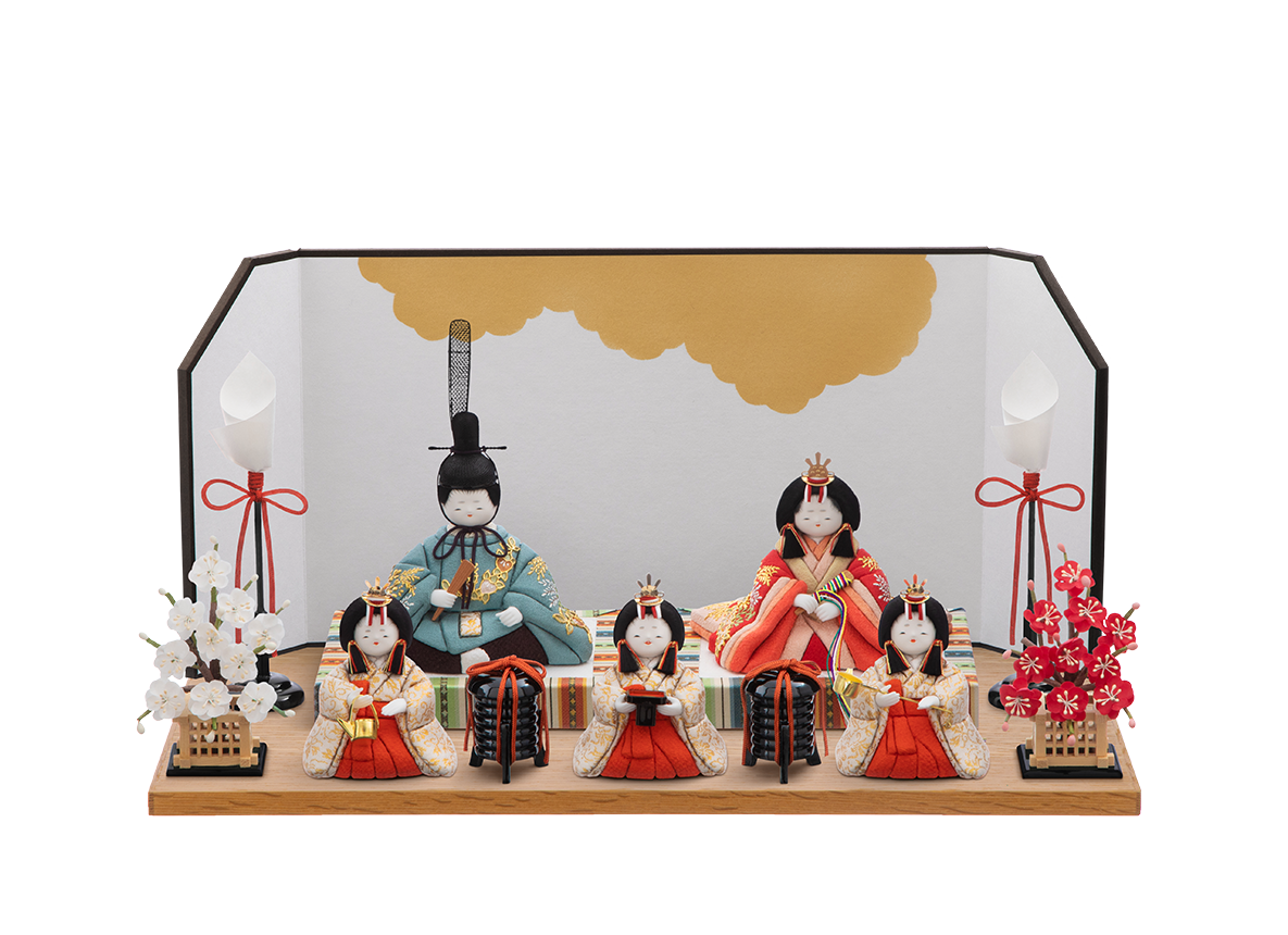 【龍村】 飾り台やお屏風が選べる、コンパクトで飾りやすいHINAシリーズの雛人形です。下ほほがふくらみを帯びたお顔だちは、いとけなくも純真無垢で麗しい赤ちゃんの一面と、成長の末、気品あふれる姿となるお子様の未来の姿が込められています。見ているこちらが思わずほほえんでしまうお顔は、五色・原孝洲特有の愛らしさです。お人形の命とも言える髪は、上質な絹糸を丁寧に結い上げ、ふっくらと空気をまとった姿に見応えがあります。上品なお顔だちに合わせ、お衣装も一段とこだわりました。お衣装には極上織物・龍村裂のお着物を着せつけました。遠き奈良〜平安時代にシルクロードから日本へ伝わった、ペルシャ風の草花模様をイメージさせる格調高い柄が、ツヤを含んだ上質な生地に浮かびあがります。体の造形は、お殿様の袂(たもと)のひだの表現、後背部には下襲の裾(したがさねのきょ)と呼ばれる部分まで再現しております。お姫さまもひだの表現や、後背部の裳袴(もばかま)と呼ばれる部分まで美しく作り込まれ、実際に着物を着重ねたようなお姿は、木目込み人形の水準の高さを示します。殿姫同様に、お子様の行く末頼もしい成長を見守る三人官女は、雛人形の華やかでいながら厳かな味わいを豊かにします。かわいいだけでは終わらない、伝えるべき大切な日本文化の美しさをこの場へ現出させてくれます。雛人形として欠かすことのできない三人官女も私たちのこだわりです。コンパクトな平らな飾り台に、すっきりとしたデザインの屏風をのせてお飾りする、上品でおしゃれな雛人形です。【蒔絵】 豪華な蒔絵のお衣装です。伝統的な美しい花浅葱色(殿)と茜色(姫)の上に、贅沢にも本金箔を使った蒔絵の技法(手描きで衣装の上から直接描く)で絵柄を施しました。草花図としての桜・橘・萩がお衣装の色彩と相まって鮮やかに浮かびます。細かな柄なので少量製作となりますが、その技の確かさから多くの方から人気の作品です。繊細美を極めた伝統的な味わいをお楽しみください。