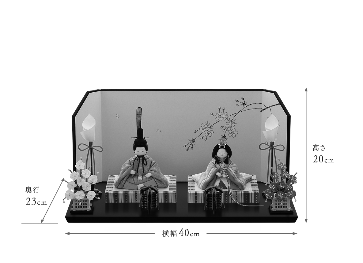 飾り台やお屏風が選べる、コンパクトシリーズの雛人形です。下ほほがふくらみを帯びたお顔だちは、純真無垢で麗しい赤ちゃんの一面と、成長の末、気品あふれる姿となるお子様の未来の姿が込められています。見ているこちらが思わずほほえんでしまうお顔は、五色・原孝洲特有の愛らしさです。お人形の命とも言える髪は、上質な絹糸を丁寧に結い上げ、ふっくらと空気をまとった姿に見応えがあります。体の造形は、お殿様の袂(たもと)のひだの表現、後背部には下襲の裾(したがさねのきょ)と呼ばれる部分まで再現しております。お姫さまもひだの表現や、後背部の裳袴(もばかま)と呼ばれる部分まで美しく作り込まれ、実際に着物を着重ねたようなお姿は、木目込み人形の水準の高さを示します。お衣装は2種類のご用意。コンパクトで平らな飾り台に、爽やかな屏風をのせてお飾りする、上品でおしゃれな雛人形です。