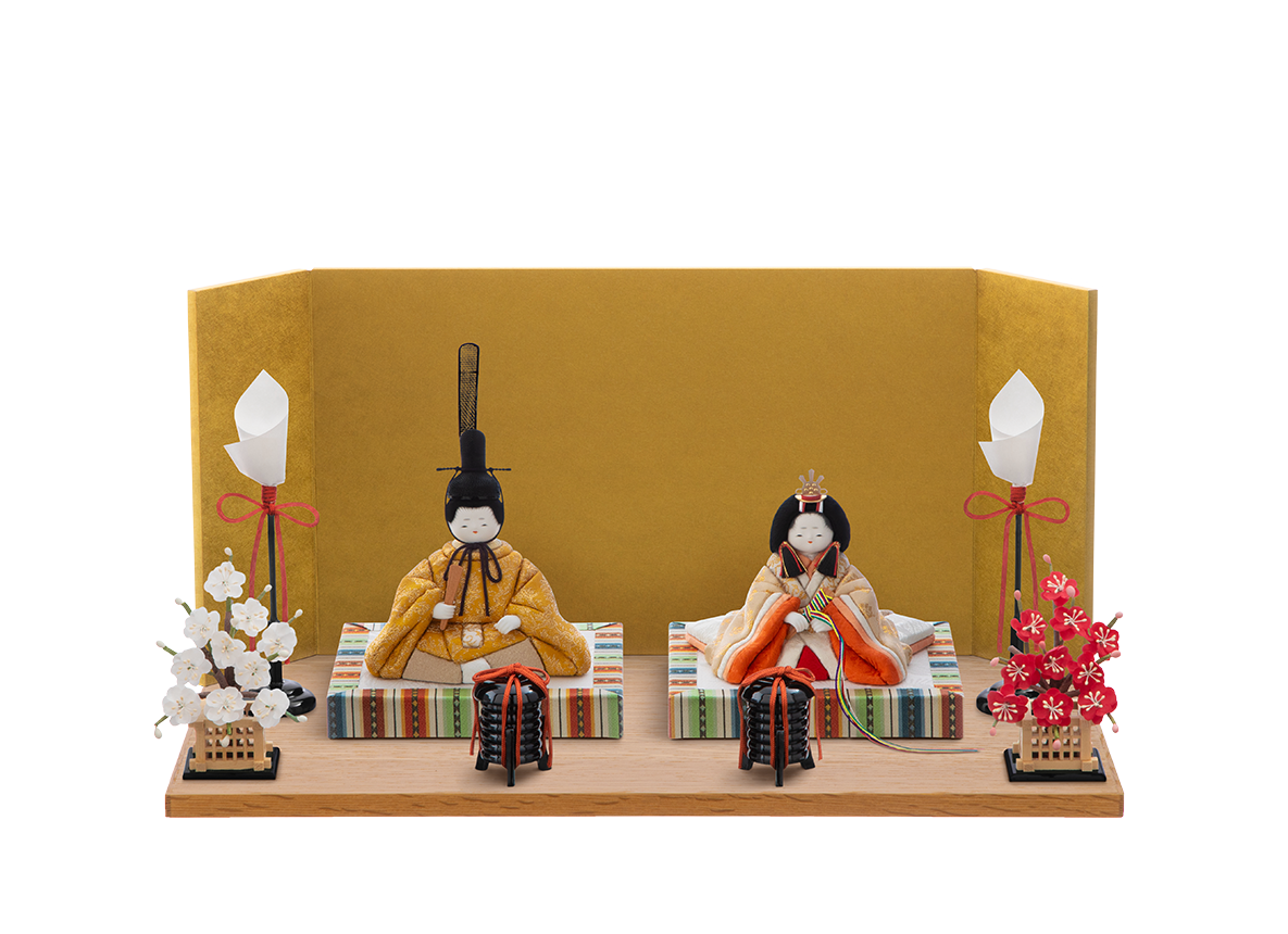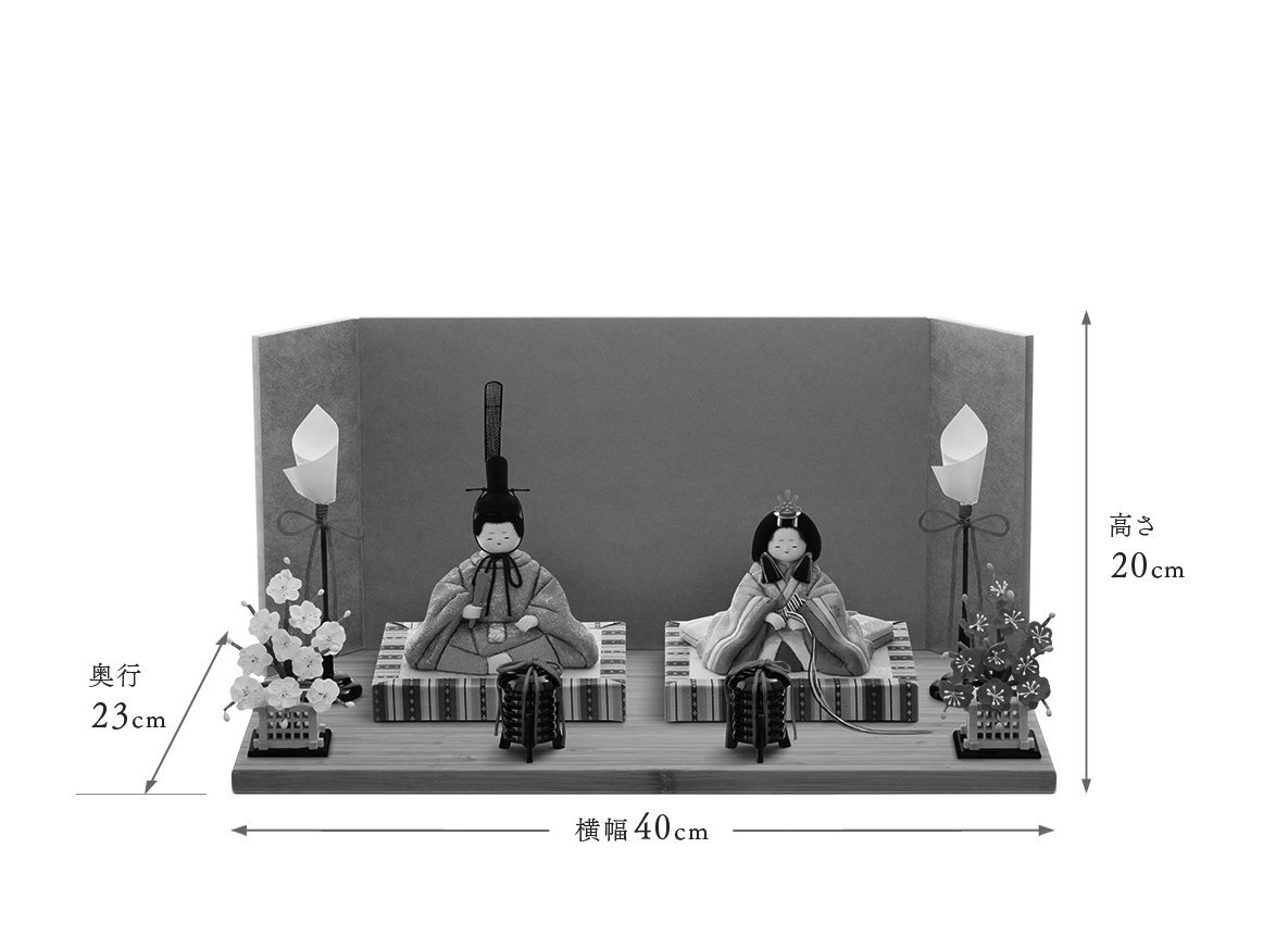 飾り台やお屏風が選べる、コンパクトシリーズの雛人形です。下ほほがふくらみを帯びたお顔だちは、純真無垢で麗しい赤ちゃんの一面と、成長の末、気品あふれる姿となるお子様の未来の姿が込められています。見ているこちらが思わずほほえんでしまうお顔は、五色・原孝洲特有の愛らしさです。お人形の命とも言える髪は、上質な絹糸を丁寧に結い上げ、ふっくらと空気をまとった姿に見応えがあります。体の造形は、お殿様の袂(たもと)のひだの表現、後背部には下襲の裾(したがさねのきょ)と呼ばれる部分まで再現しております。お姫さまもひだの表現や、後背部の裳袴(もばかま)と呼ばれる部分まで美しく作り込まれ、実際に着物を着重ねたようなお姿は、木目込み人形の水準の高さを示します。お衣装は2種類のご用意。コンパクトで平らな飾り台に、爽やかな屏風をのせてお飾りする、上品でおしゃれな雛人形です。