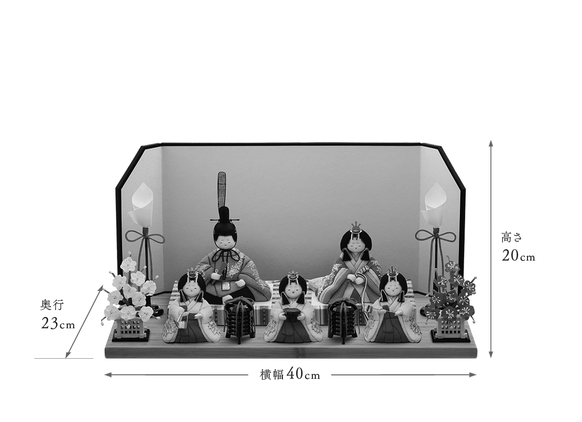 お人形やお道具などゆったりとお飾りいただける飾り台幅45cmの「竹」にご変更可能です。詳細はこちら⇒Topics「末広雛五人飾りの飾り台_竹につきまして」