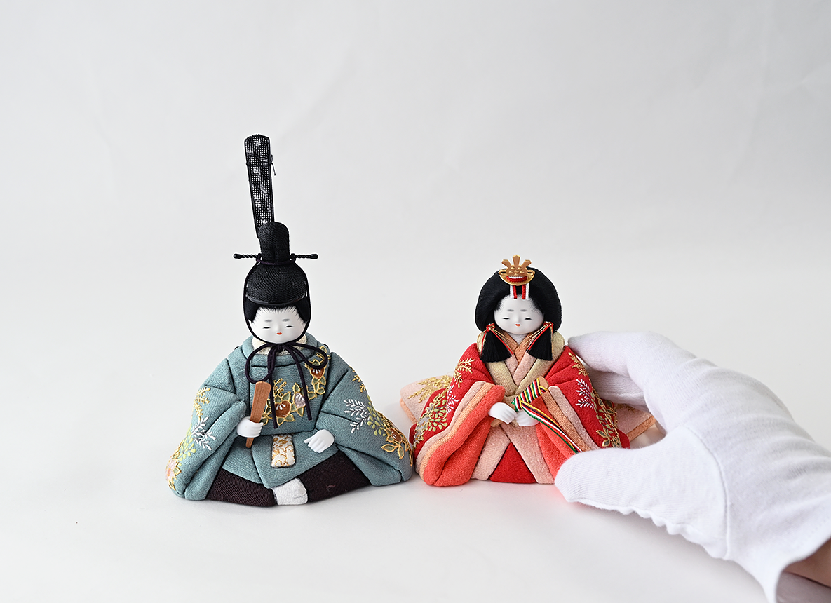 飾り台やお屏風が選べる、コンパクトで飾りやすいHINAシリーズの雛人形です。お殿様・お姫様をお飾りしている台へ、一緒に三人官女まで並べられる五人飾りです。下ほほがふくらみを帯びたお顔だちは、いとけなくも純真無垢で麗しい赤ちゃんの一面と、成長の末、気品あふれる姿となるお子様の未来の姿が込められています。見ているこちらが思わずほほえんでしまうこのお顔は、五色・原孝洲特有の愛らしさです。お人形の命とも言える髪は、上質な絹糸を丁寧に結い上げ、ふっくらと空気をまとった姿に見応えがあります。上品なお顔だちに合わせ、殿姫のお衣装もより手をかけた豪華な蒔絵のお衣装です。伝統的な美しい花浅葱色(殿)と茜色(姫)の上に、贅沢にも本金箔を使った蒔絵の技法(手描きで衣装の上から直接描く)で絵柄を施しました。雅な草花図としての桜・橘・萩がお衣装の色彩と相まって鮮やかに浮かびあがります。体の造形もお殿様の袂(たもと)のひだの表現、後背部には下襲の裾(したがさねのきょ)と呼ばれる部分まで再現しております。お姫さまもひだの表現や、後背部の裳袴(もばかま)と呼ばれる部分まで美しく作り込まれ、実際に着物を着重ねたようなお姿は、木目込み人形の水準の高さを示します。殿姫同様に、お子様の行く末頼もしい成長を見守る三人官女は、雛人形の華やかでいながら厳かな味わいを豊かにします。かわいいだけでは終わらない、伝えるべき大切な日本文化の美しさをこの場へ現出させてくれます。雛人形として欠かすことのできない三人官女も私たちのこだわりです。インテリアにもよく調和するデザインの飾り台と屏風でお飾りいただく、すっきりとおしゃれな雛人形です。