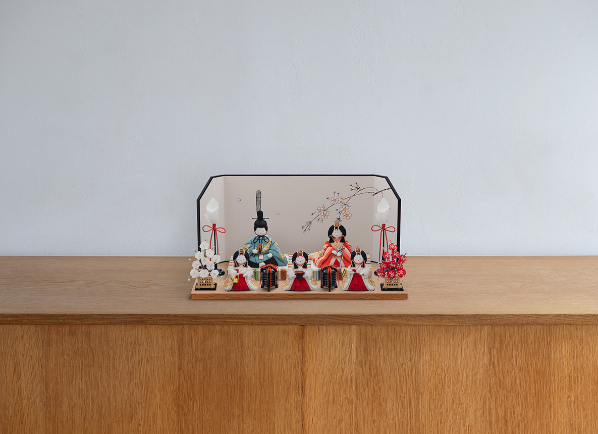 飾り台やお屏風が選べる、コンパクトで飾りやすいHINAシリーズの雛人形です。お殿様・お姫様をお飾りしている台へ、一緒に三人官女まで並べられる五人飾りです。下ほほがふくらみを帯びたお顔だちは、いとけなくも純真無垢で麗しい赤ちゃんの一面と、成長の末、気品あふれる姿となるお子様の未来の姿が込められています。見ているこちらが思わずほほえんでしまうこのお顔は、五色・原孝洲特有の愛らしさです。お人形の命とも言える髪は、上質な絹糸を丁寧に結い上げ、ふっくらと空気をまとった姿に見応えがあります。上品なお顔だちに合わせ、殿姫のお衣装もより手をかけた豪華な蒔絵のお衣装です。伝統的な美しい花浅葱色(殿)と茜色(姫)の上に、贅沢にも本金箔を使った蒔絵の技法(手描きで衣装の上から直接描く)で絵柄を施しました。雅な草花図としての桜・橘・萩がお衣装の色彩と相まって鮮やかに浮かびあがります。体の造形もお殿様の袂(たもと)のひだの表現、後背部には下襲の裾(したがさねのきょ)と呼ばれる部分まで再現しております。お姫さまもひだの表現や、後背部の裳袴(もばかま)と呼ばれる部分まで美しく作り込まれ、実際に着物を着重ねたようなお姿は、木目込み人形の水準の高さを示します。殿姫同様に、お子様の行く末頼もしい成長を見守る三人官女は、雛人形の華やかでいながら厳かな味わいを豊かにします。かわいいだけでは終わらない、伝えるべき大切な日本文化の美しさをこの場へ現出させてくれます。雛人形として欠かすことのできない三人官女も私たちのこだわりです。インテリアにもよく調和するデザインの飾り台と屏風でお飾りいただく、すっきりとおしゃれな雛人形です。