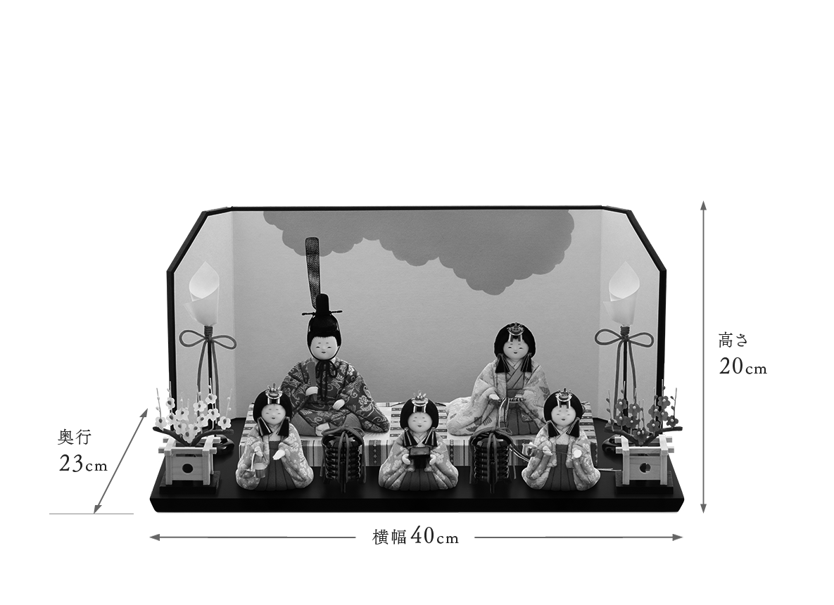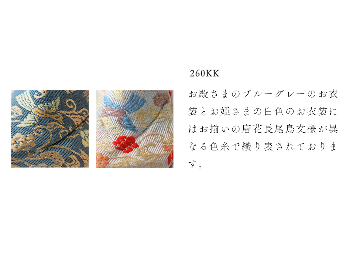 五色・原孝洲を代表するコンパクトなおひなさまです。流行やトレンドに左右されない、凛とした佇まいと上品で愛らしいお顔が人気です。美しい鳳凰(ほうおう)が舞うお衣装はお子さまの門出を祝す証。瑞鳥の鳳凰が縁起よくお子さまの明るい未来を導きます。美しくきめ細かい絹織物の美を感じてください。