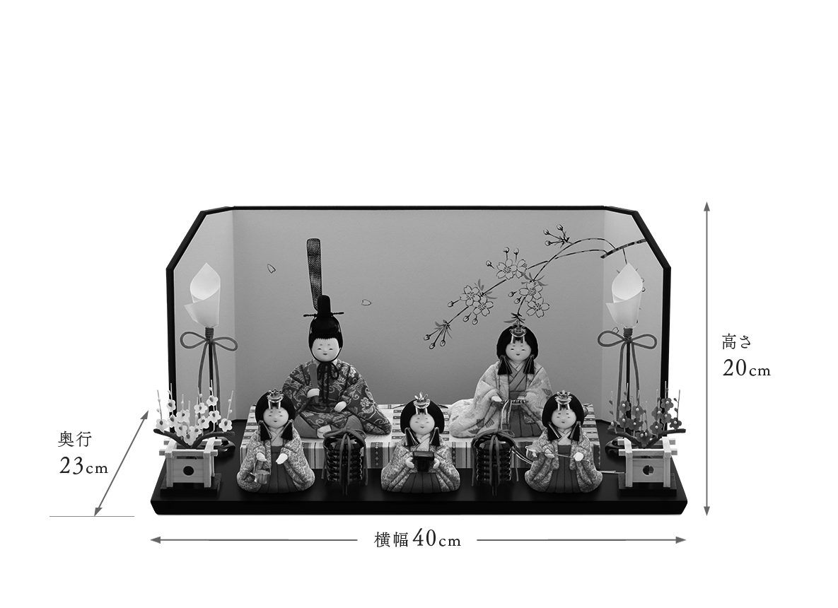 五色・原孝洲を代表するコンパクトなおひなさまです。流行やトレンドに左右されない、凛とした佇まいと上品で愛らしいお顔が人気です。美しい鳳凰(ほうおう)が舞うお衣装はお子さまの門出を祝す証。瑞鳥の鳳凰が縁起よくお子さまの明るい未来を導きます。美しくきめ細かい絹織物の美を感じてください。