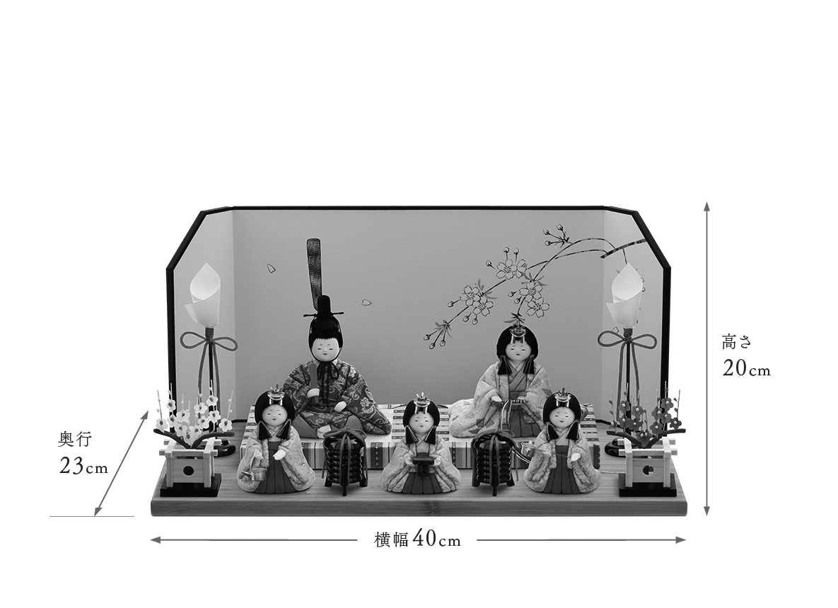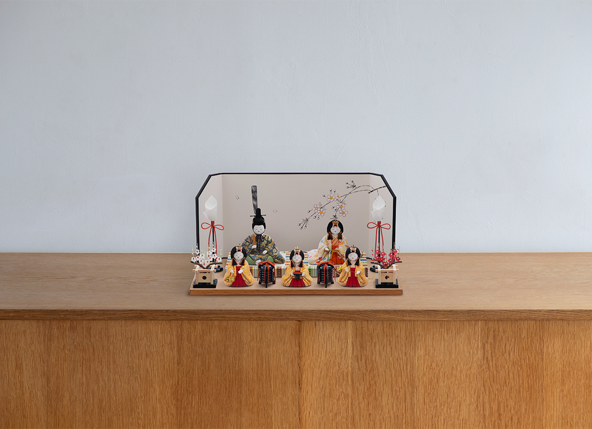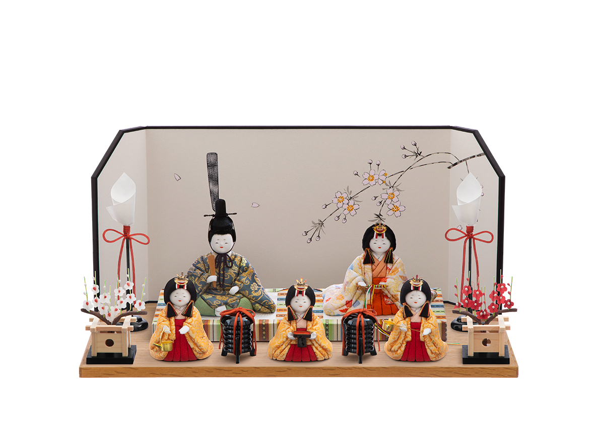 五色・原孝洲を代表するコンパクトなおひなさまです。流行やトレンドに左右されない、凛とした佇まいと上品で愛らしいお顔が人気です。美しい鳳凰(ほうおう)が舞うお衣装はお子さまの門出を祝す証。瑞鳥の鳳凰が縁起よくお子さまの明るい未来を導きます。美しくきめ細かい絹織物の美を感じてください。