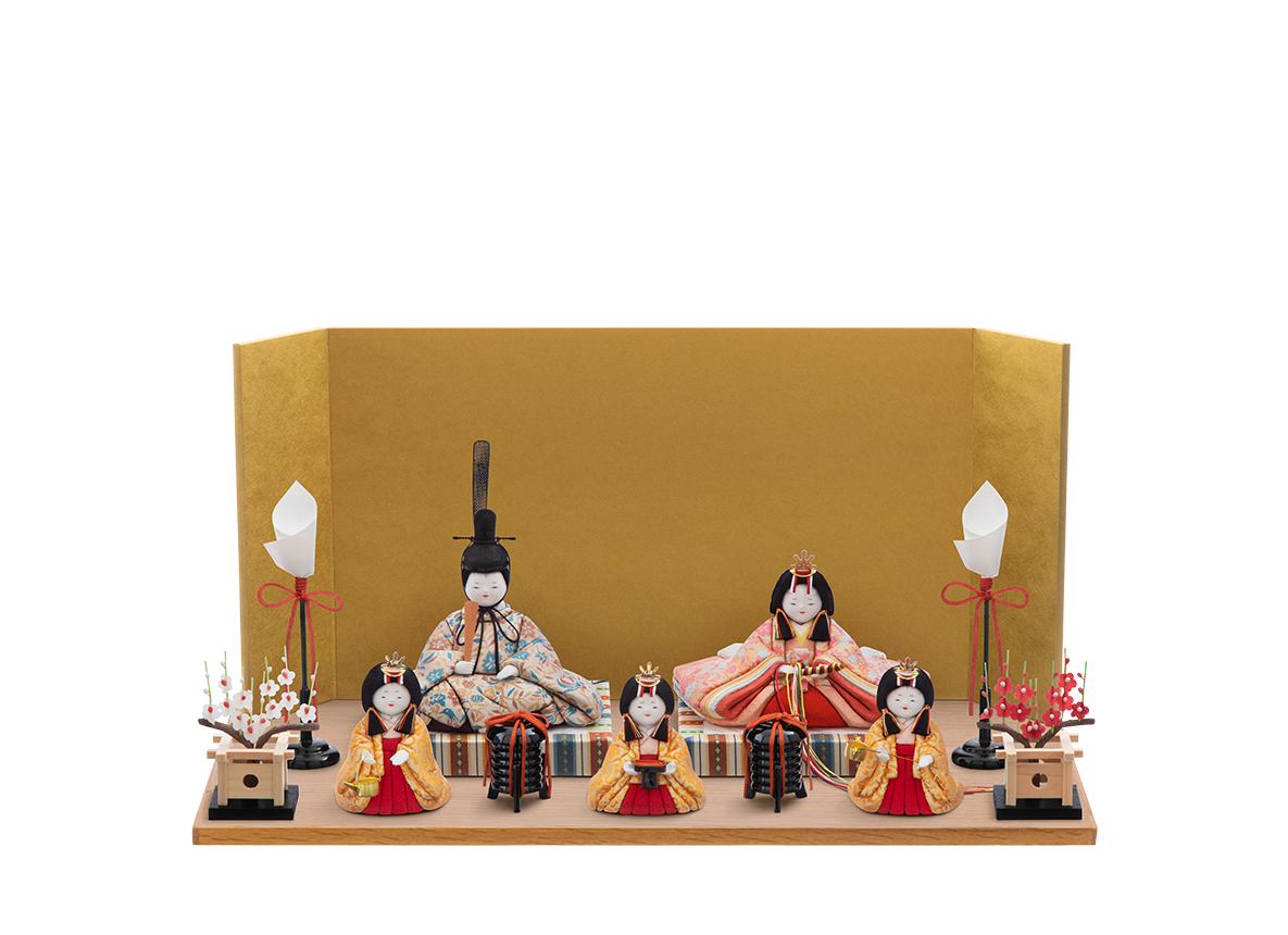 五人囃子に至るまで工夫を凝らし精緻なお作りを心がける、五色・原孝洲の特別なお人形さんです。まず目を惹くのはその髪型。その昔実際に幼児や子供の髪型とされた習俗を取り入れており、かわいらしいだけでない、文化を後世に伝えることができる本格のお人形づくりを心がけました。例えば、太鼓と大鼓、笛の子は「奴」(やっこ)と呼ばれる髪型。真ん中の小鼓の子は「唐子」(からこ)、右端の謡(うたい)の子は「芥子坊主」(けしぼうず)という特徴的な髪型です。ここまで髪型にこだわった五人囃子は他に例がありません。お殿さまとお姫さま、三人官女の五人飾りに追加する五人囃子として、全体の雰囲気をより華やかにすることでしょう。サイズ感としては、主にHINAシリーズ40〜45cm用の雛人形たちと合います。