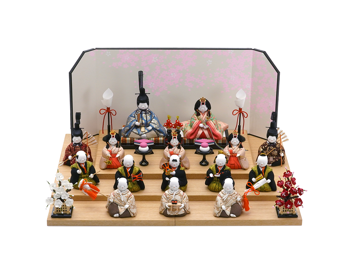 木目込み人形だからこそ演出できる小さく、コンパクトな世界によって桃の節句が待ち遠しくなる雛飾りです。殿姫の下ほほがふくらみを帯びたお顔だちは、いとけなくも純真無垢で麗しい赤ちゃんの一面と、成長の末、気品あふれる姿となるお子様の未来の姿が込められています。見ているこちらが思わずほほえんでしまうお顔は、五色・原孝洲特有の愛らしさです。三人官女は、香り立つ品格の中に親王様へお仕えし、見護るにふさわしい慈愛で満ちています。三人の方々は独特のお道具を携えます。向かって右は「長柄銚子」(ながえのちょうし)、中央は「三方」(さんぽう)を、左には「加銚子」(くわえのちょうし)を手にします。いずれも宮中でのおつとめや行事に由来し、雛人形の華やかでいながら厳かな雰囲気を増します。中段の五人囃子は、昔の幼児の髪型をうつしとった五色・原孝洲独自の髪型に愛嬌があります。向かって右より、謡(うたい)、笛、小鼓(こつづみ)、大鼓(おおつづみ)、太鼓(たいこ)の順で、神事に通じる能舞台を見るような味わいがあります。随身は親王の護衛を司り、最下段の仕丁たちは貴人のお供をする大切な方々です。とりわけてこちらの15人飾り最大の特徴は、贅沢に全員へ高級絹織物の龍村裂の布地を着せつけたことです。ツヤを含んだ美しい衣装には、はるか昔シルクロードを通じ日本へ伝わった草花柄が盛り込まれております。飾り段はセパレート式の平台を積み重ねて三段にする簡単にセッティングできる仕組みなので、成長されたお子様が自身で楽しそうにお人形をお飾りする姿が目に浮かぶようです。お選びいただいた飾り段に、シンプルなデザインの屏風をお飾りいただくセットです。雛人形の花形である15人全員が、素敵なひな祭りの世界へいざなってくれるでしょう。
