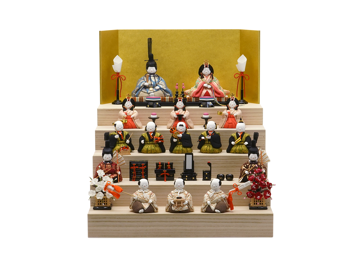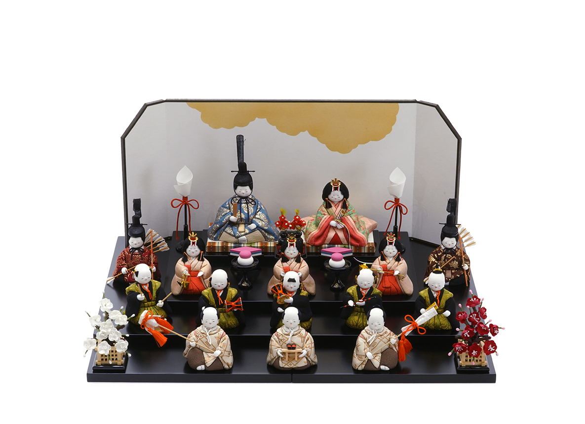 お人形をお飾りする段がそのまま収納箱になる、コンパクトなかわいらしい雛人形です。木目込み人形だからこそ演出できる小さく、コンパクトな世界によって桃の節句が待ち遠しくなる雛飾りです。殿姫の下ほほがふくらみを帯びたお顔だちは、いとけなくも純真無垢で麗しい赤ちゃんの一面と、成長の末、気品あふれる姿となるお子様の未来の姿が込められています。見ているこちらが思わずほほえんでしまうお顔は、五色・原孝洲特有の愛らしさです。三人官女は、香り立つ品格の中に親王様へお仕えし、見護るにふさわしい慈愛で満ちています。三人の方々は独特のお道具を携えます。向かって右は「長柄銚子」(ながえのちょうし)、中央は「三方」(さんぽう)を、左には「加銚子」(くわえのちょうし)を手にします。いずれも宮中でのおつとめや行事に由来し、雛人形の華やかでいながら厳かな雰囲気を増します。中段の五人囃子は、昔の幼児の髪型をうつしとった五色・原孝洲独自の髪型に愛嬌があります。向かって右より、謡(うたい)、笛、小鼓(こつづみ)、大鼓(おおつづみ)、太鼓(たいこ)の順で、神事に通じる能舞台を見るような味わいがあります。随身は親王の護衛を司り、最下段の仕丁たちは貴人のお供をする大切な方々です。とりわけてこちらの15人飾り最大の特徴は、贅沢に全員へ高級絹織物の龍村裂の布地を着せつけたことです。ツヤを含んだ美しい衣装には、はるか昔シルクロードを通じ日本へ伝わった草花柄が盛り込まれております。お子様へ特に人気なのは、木製で仕上げた嫁入道具(たんす・長持・鏡台・火鉢・針箱)で小さなお道具ながら、引出しが一つ一つ開くこだわりぶりです。成長されたお子様が自身で楽しそうに道具やお人形をお飾りする姿が目に浮かぶようです。飾り段がそのまま小さな収納箱となり、お人形やお道具をしまうことができます。シンプルなデザインの屏風をお飾りいただくセットです。雛人形の花形である15人全員が、素敵なひな祭りの世界へいざなってくれるでしょう。