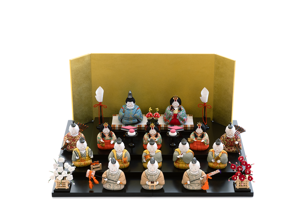 お人形をお飾りする段がそのまま収納箱になる、コンパクトなかわいらしい雛人形です。木目込み人形だからこそ演出できる小さく、コンパクトな世界によって桃の節句が待ち遠しくなる雛飾りです。生まれたばかりの赤ちゃんをイメージさせる小さくて丸々としたフォルムは、木目込み人形ならではの雛人形です。見ているこちらが思わずほほえんでしまうお顔は、五色・原孝洲特有の愛らしさです。三人官女は、香り立つ品格の中に親王様へお仕えし、見護るにふさわしい慈愛で満ちています。三人の方々は独特のお道具を携えます。向かって右は「長柄銚子」(ながえのちょうし)、中央は「三方」(さんぽう)を、左には「加銚子」(くわえのちょうし)を手にします。いずれも宮中でのおつとめや行事に由来し、雛人形の華やかでいながら厳かな雰囲気を増します。中段の五人囃子は、髪型を縁起の良い手描きの水引姿で表したところに愛嬌があります。向かって右より、謡(うたい)、笛、小鼓(こつづみ)、大鼓(おおつづみ)、太鼓(たいこ)の順で、神事に通じる能舞台を見るような味わいがあります。随身は親王の護衛を司り、最下段の仕丁たちは貴人のお供をする大切な方々です。とりわけてこちらの15人飾り最大の特徴は、贅沢に全員へ高級絹織物の龍村裂の布地を着せつけたことです。ツヤを含んだ美しい衣装には、はるか昔シルクロードを通じ日本へ伝わった草花柄が盛り込まれております。飾り段はセパレート式の平台を積み重ねて三段にする簡単にセッティングできる仕組みなので、成長されたお子様が自身で楽しそうにお人形をお飾りする姿が目に浮かぶようです。重ねた飾り段に、シンプルなデザインの屏風をお飾りいただくセットです。雛人形の花形である15人全員が、素敵なひな祭りの世界へいざなってくれるでしょう。