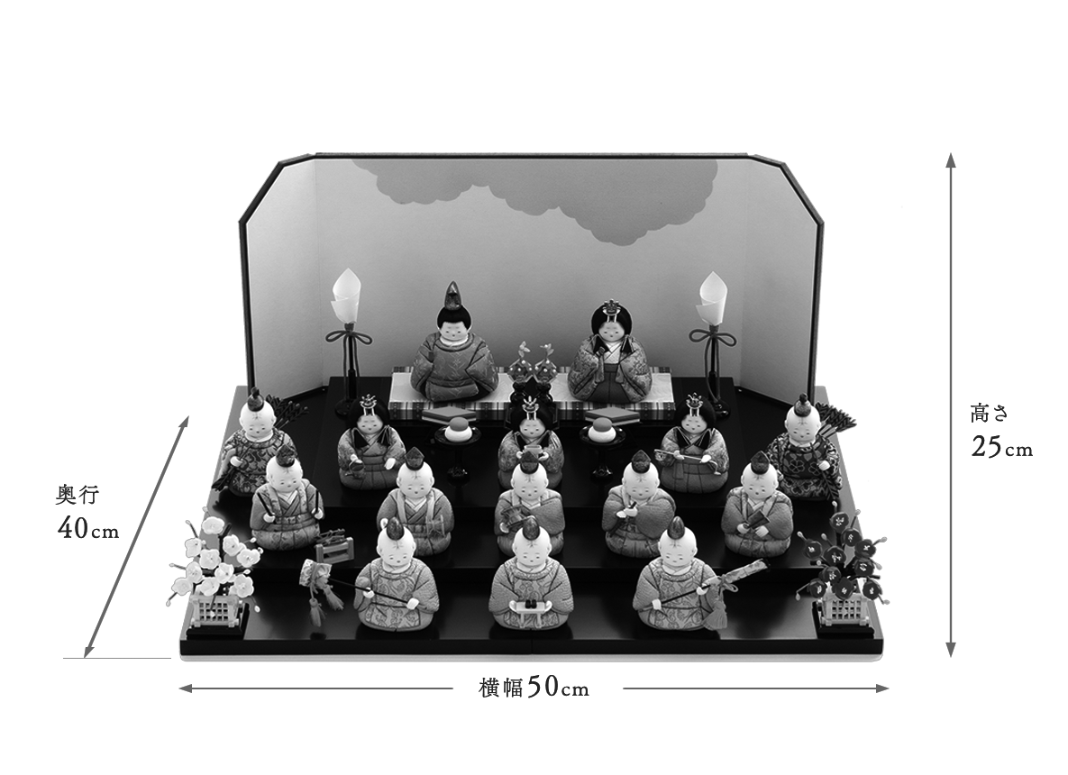 お人形をお飾りする段がそのまま収納箱になる、コンパクトなかわいらしい雛人形です。木目込み人形だからこそ演出できる小さく、コンパクトな世界によって桃の節句が待ち遠しくなる雛飾りです。生まれたばかりの赤ちゃんをイメージさせる小さくて丸々としたフォルムは、木目込み人形ならではの雛人形です。見ているこちらが思わずほほえんでしまうお顔は、五色・原孝洲特有の愛らしさです。三人官女は、香り立つ品格の中に親王様へお仕えし、見護るにふさわしい慈愛で満ちています。三人の方々は独特のお道具を携えます。向かって右は「長柄銚子」(ながえのちょうし)、中央は「三方」(さんぽう)を、左には「加銚子」(くわえのちょうし)を手にします。いずれも宮中でのおつとめや行事に由来し、雛人形の華やかでいながら厳かな雰囲気を増します。中段の五人囃子は、髪型を縁起の良い手描きの水引姿で表したところに愛嬌があります。向かって右より、謡(うたい)、笛、小鼓(こつづみ)、大鼓(おおつづみ)、太鼓(たいこ)の順で、神事に通じる能舞台を見るような味わいがあります。随身は親王の護衛を司り、最下段の仕丁たちは貴人のお供をする大切な方々です。とりわけてこちらの15人飾り最大の特徴は、贅沢に全員へ高級絹織物の龍村裂の布地を着せつけたことです。ツヤを含んだ美しい衣装には、はるか昔シルクロードを通じ日本へ伝わった草花柄が盛り込まれております。飾り段はセパレート式の平台を積み重ねて三段にする簡単にセッティングできる仕組みなので、成長されたお子様が自身で楽しそうにお人形をお飾りする姿が目に浮かぶようです。重ねた飾り段に、シンプルなデザインの屏風をお飾りいただくセットです。雛人形の花形である15人全員が、素敵なひな祭りの世界へいざなってくれるでしょう。