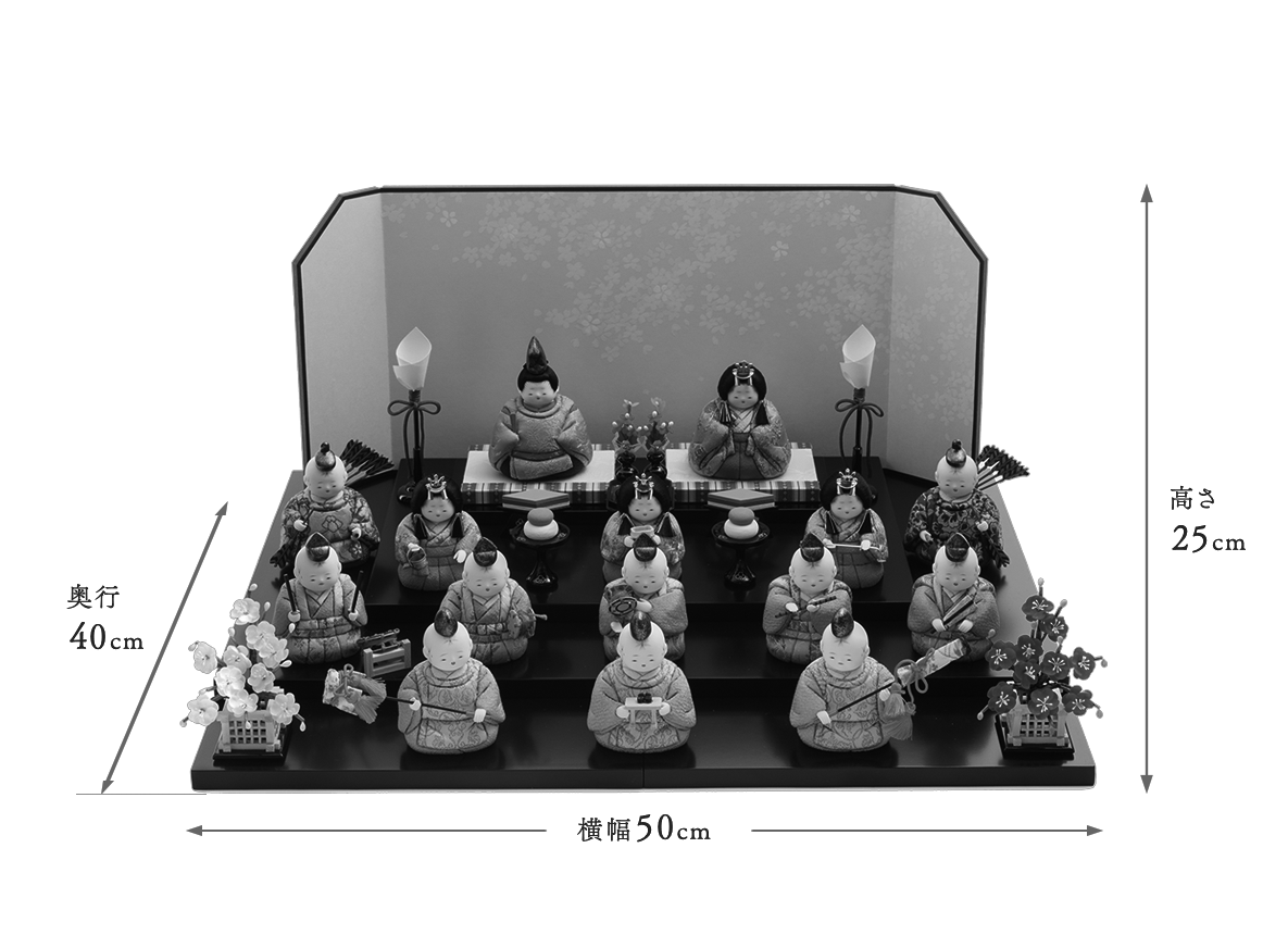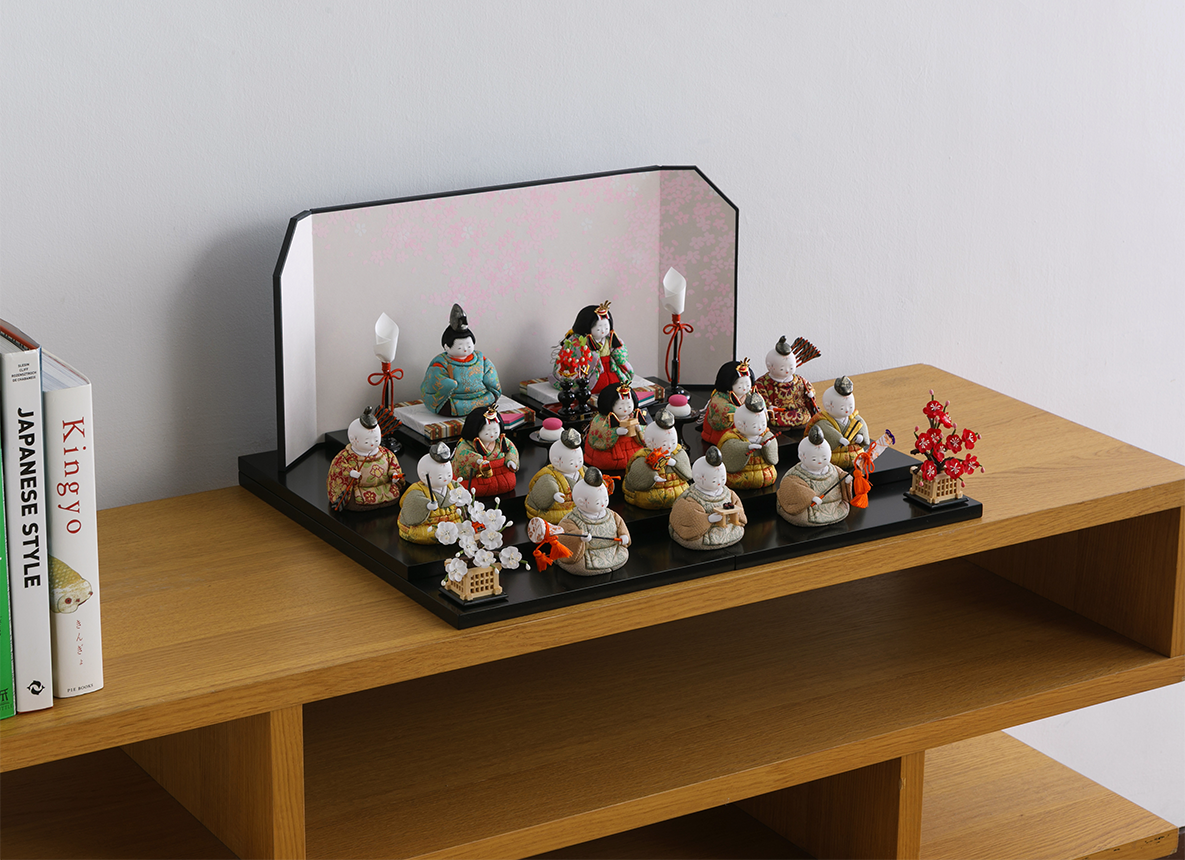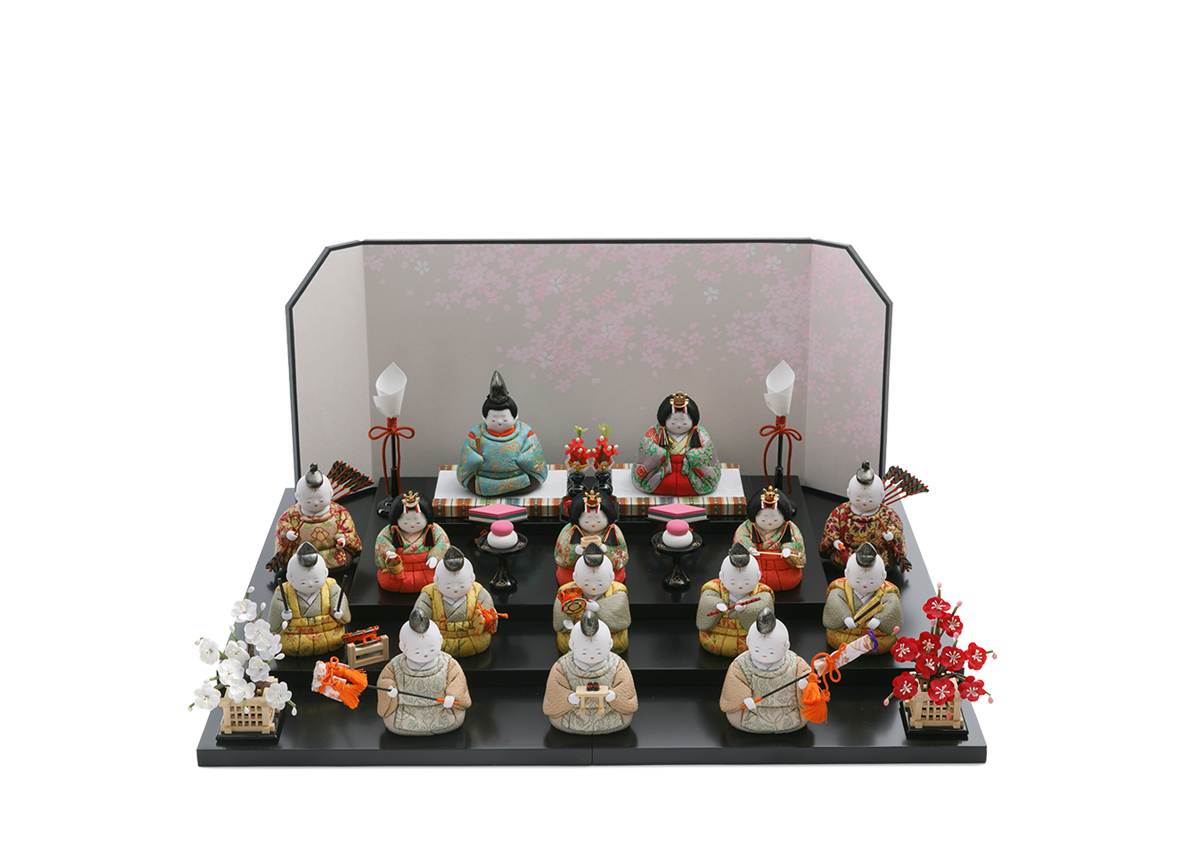 お人形をお飾りする段がそのまま収納箱になる、コンパクトなかわいらしい雛人形です。木目込み人形だからこそ演出できる小さく、コンパクトな世界によって桃の節句が待ち遠しくなる雛飾りです。生まれたばかりの赤ちゃんをイメージさせる小さくて丸々としたフォルムは、木目込み人形ならではの雛人形です。見ているこちらが思わずほほえんでしまうお顔は、五色・原孝洲特有の愛らしさです。三人官女は、香り立つ品格の中に親王様へお仕えし、見護るにふさわしい慈愛で満ちています。三人の方々は独特のお道具を携えます。向かって右は「長柄銚子」(ながえのちょうし)、中央は「三方」(さんぽう)を、左には「加銚子」(くわえのちょうし)を手にします。いずれも宮中でのおつとめや行事に由来し、雛人形の華やかでいながら厳かな雰囲気を増します。中段の五人囃子は、髪型を縁起の良い手描きの水引姿で表したところに愛嬌があります。向かって右より、謡(うたい)、笛、小鼓(こつづみ)、大鼓(おおつづみ)、太鼓(たいこ)の順で、神事に通じる能舞台を見るような味わいがあります。随身は親王の護衛を司り、最下段の仕丁たちは貴人のお供をする大切な方々です。とりわけてこちらの15人飾り最大の特徴は、贅沢に全員へ高級絹織物の龍村裂の布地を着せつけたことです。ツヤを含んだ美しい衣装には、はるか昔シルクロードを通じ日本へ伝わった草花柄が盛り込まれております。飾り段はセパレート式の平台を積み重ねて三段にする簡単にセッティングできる仕組みなので、成長されたお子様が自身で楽しそうにお人形をお飾りする姿が目に浮かぶようです。重ねた飾り段に、シンプルなデザインの屏風をお飾りいただくセットです。雛人形の花形である15人全員が、素敵なひな祭りの世界へいざなってくれるでしょう。
