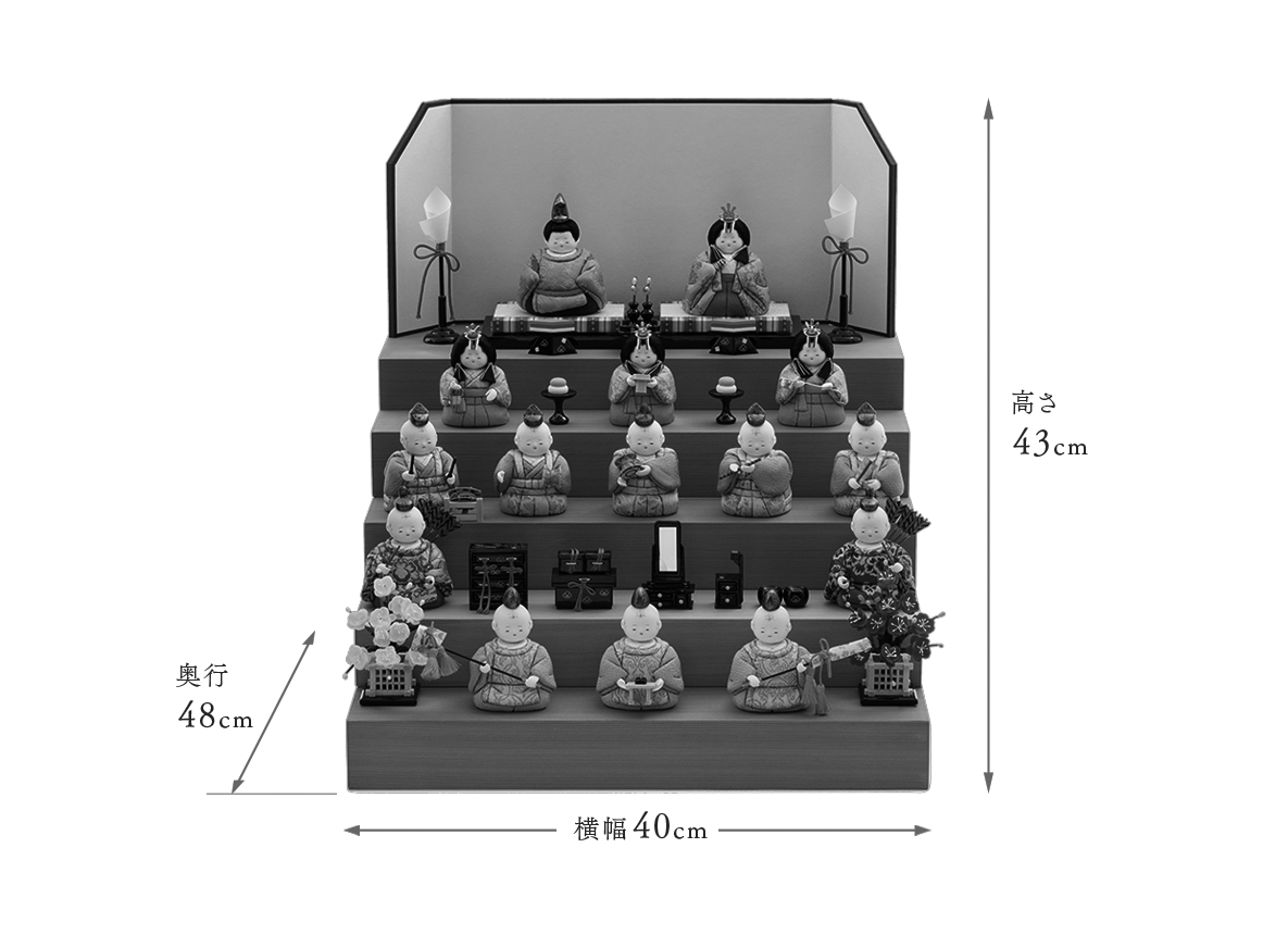 お人形をお飾りする段がそのまま収納箱になる、コンパクトなかわいらしい雛人形です。木目込み人形だからこそ演出できる小さく、コンパクトな世界によって桃の節句が待ち遠しくなる雛飾りです。生まれたばかりの赤ちゃんをイメージさせる小さくて丸々としたフォルムは、木目込み人形ならではの雛人形です。見ているこちらが思わずほほえんでしまうお顔は、五色・原孝洲特有の愛らしさです。三人官女は、香り立つ品格の中に親王様へお仕えし、見護るにふさわしい慈愛で満ちています。三人の方々は独特のお道具を携えます。向かって右は「長柄銚子」(ながえのちょうし)、中央は「三方」(さんぽう)を、左には「加銚子」(くわえのちょうし)を手にします。いずれも宮中でのおつとめや行事に由来し、雛人形の華やかでいながら厳かな雰囲気を増します。中段の五人囃子は、髪型を縁起の良い手描きの水引姿で表したところに愛嬌があります。向かって右より、謡(うたい)、笛、小鼓(こつづみ)、大鼓(おおつづみ)、太鼓(たいこ)の順で、神事に通じる能舞台を見るような味わいがあります。随身は親王の護衛を司り、最下段の仕丁たちは貴人のお供をする大切な方々です。とりわけてこちらの15人飾り最大の特徴は、贅沢に全員へ高級絹織物の龍村裂の布地を着せつけたことです。ツヤを含んだ美しい衣装には、はるか昔シルクロードを通じ日本へ伝わった草花柄が盛り込まれております。お子様へ特に人気なのは、木製で仕上げた嫁入道具(たんす・長持・鏡台・火鉢・針箱)で小さなお道具ながら、引出しが一つ一つ開くこだわりぶりです。成長されたお子様が自身で楽しそうに道具やお人形をお飾りする姿が目に浮かぶようです。飾り段がそのまま小さな収納箱となり、お人形やお道具をしまうことができます。シンプルなデザインの屏風をお飾りいただくセットです。雛人形の花形である15人全員が、素敵なひな祭りの世界へいざなってくれるでしょう。