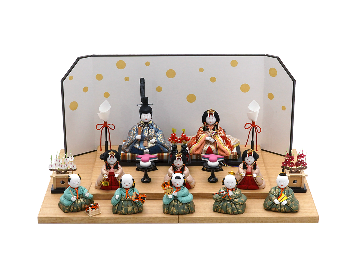 桃の節句の気分を盛り上げる五人囃子まで揃った十人のセットで、複雑な組み立てなどがなく、気軽にお飾りできる雛人形です。こちらのお人形の最大の見どころは、お殿様・お姫様から五人囃子に至るまで、十人ともに最高級織物・龍村裂(たつむらぎれ)のお衣装を身にまとっていることです。ツヤのある美しい布地には、遠き奈良〜平安時代にシルクロードから日本へ伝わった、ペルシャ風の草花模様をイメージさせる雅な柄を織り込み着せ付けました。上品で素敵なお衣装に合わせ、お顔立ちもただ幼いだけではない、柔らかみと気品の融合を大事にした五色・原孝洲が大切にする姿となりました。三人官女は、香り立つ品格の中に親王様へお仕えし、見護るにふさわしい慈愛で満ちています。三人の方々は独特のお道具を携えます。向かって右は「長柄銚子」(ながえのちょうし)、中央は「三方」(さんぽう)を、左には「加銚子」(くわえのちょうし)を手にします。いずれも宮中でのおつとめや行事に由来し、雛人形の華やかでいながら厳かな雰囲気を増します。五人囃子は、他ではなかなか見ることのできない昔の子供の髪型を再現しているのがとても人気です。向かって右より、謡(うたい)、笛、小鼓(こつづみ)、大鼓(おおつづみ)、太鼓(たいこ)の順で、宴にふさわしい華やぎで、お子さまを笑顔にするようなそんな作品です。薄く平たい台を重ねて段にし、選べる屏風を立ててお飾りいただくセットです。お子様の成長を末長く見守るにふさわしい堂々としたお雛さまです。