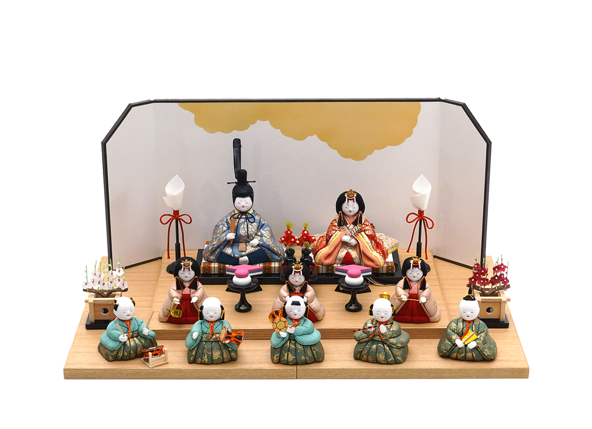 桃の節句の気分を盛り上げる五人囃子まで揃った十人のセットで、複雑な組み立てなどがなく、気軽にお飾りできる雛人形です。こちらのお人形の最大の見どころは、お殿様・お姫様から五人囃子に至るまで、十人ともに最高級織物・龍村裂(たつむらぎれ)のお衣装を身にまとっていることです。ツヤのある美しい布地には、遠き奈良〜平安時代にシルクロードから日本へ伝わった、ペルシャ風の草花模様をイメージさせる雅な柄を織り込み着せ付けました。上品で素敵なお衣装に合わせ、お顔立ちもただ幼いだけではない、柔らかみと気品の融合を大事にした五色・原孝洲が大切にする姿となりました。三人官女は、香り立つ品格の中に親王様へお仕えし、見護るにふさわしい慈愛で満ちています。三人の方々は独特のお道具を携えます。向かって右は「長柄銚子」(ながえのちょうし)、中央は「三方」(さんぽう)を、左には「加銚子」(くわえのちょうし)を手にします。いずれも宮中でのおつとめや行事に由来し、雛人形の華やかでいながら厳かな雰囲気を増します。五人囃子は、他ではなかなか見ることのできない昔の子供の髪型を再現しているのがとても人気です。向かって右より、謡(うたい)、笛、小鼓(こつづみ)、大鼓(おおつづみ)、太鼓(たいこ)の順で、宴にふさわしい華やぎで、お子さまを笑顔にするようなそんな作品です。薄く平たい台を重ねて段にし、選べる屏風を立ててお飾りいただくセットです。お子様の成長を末長く見守るにふさわしい堂々としたお雛さまです。