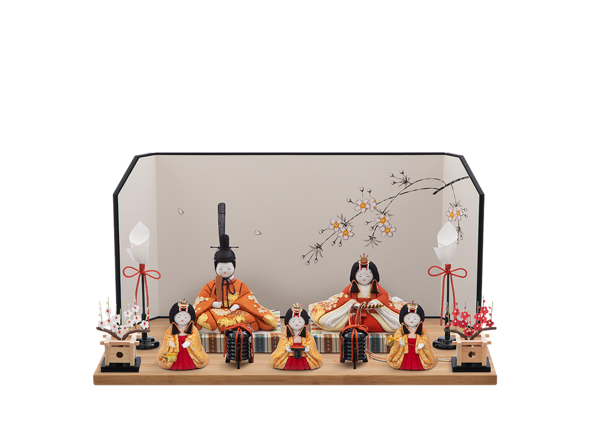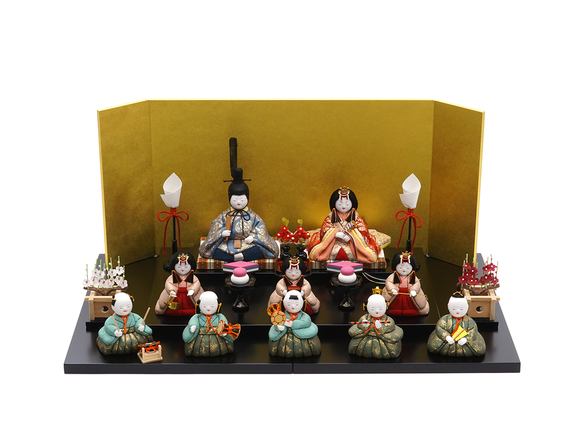 桃の節句の気分を盛り上げる五人囃子まで揃った十人のセットで、複雑な組み立てなどがなく、気軽にお飾りできる雛人形です。こちらのお人形の最大の見どころは、お殿様・お姫様から五人囃子に至るまで、十人ともに最高級織物・龍村裂(たつむらぎれ)のお衣装を身にまとっていることです。ツヤのある美しい布地には、遠き奈良〜平安時代にシルクロードから日本へ伝わった、ペルシャ風の草花模様をイメージさせる雅な柄を織り込み着せ付けました。上品で素敵なお衣装に合わせ、お顔立ちもただ幼いだけではない、柔らかみと気品の融合を大事にした五色・原孝洲が大切にする姿となりました。三人官女は、香り立つ品格の中に親王様へお仕えし、見護るにふさわしい慈愛で満ちています。三人の方々は独特のお道具を携えます。向かって右は「長柄銚子」(ながえのちょうし)、中央は「三方」(さんぽう)を、左には「加銚子」(くわえのちょうし)を手にします。いずれも宮中でのおつとめや行事に由来し、雛人形の華やかでいながら厳かな雰囲気を増します。五人囃子は、他ではなかなか見ることのできない昔の子供の髪型を再現しているのがとても人気です。向かって右より、謡(うたい)、笛、小鼓(こつづみ)、大鼓(おおつづみ)、太鼓(たいこ)の順で、宴にふさわしい華やぎで、お子さまを笑顔にするようなそんな作品です。薄く平たい台を重ねて段にし、選べる屏風を立ててお飾りいただくセットです。お子様の成長を末長く見守るにふさわしい堂々としたお雛さまです。