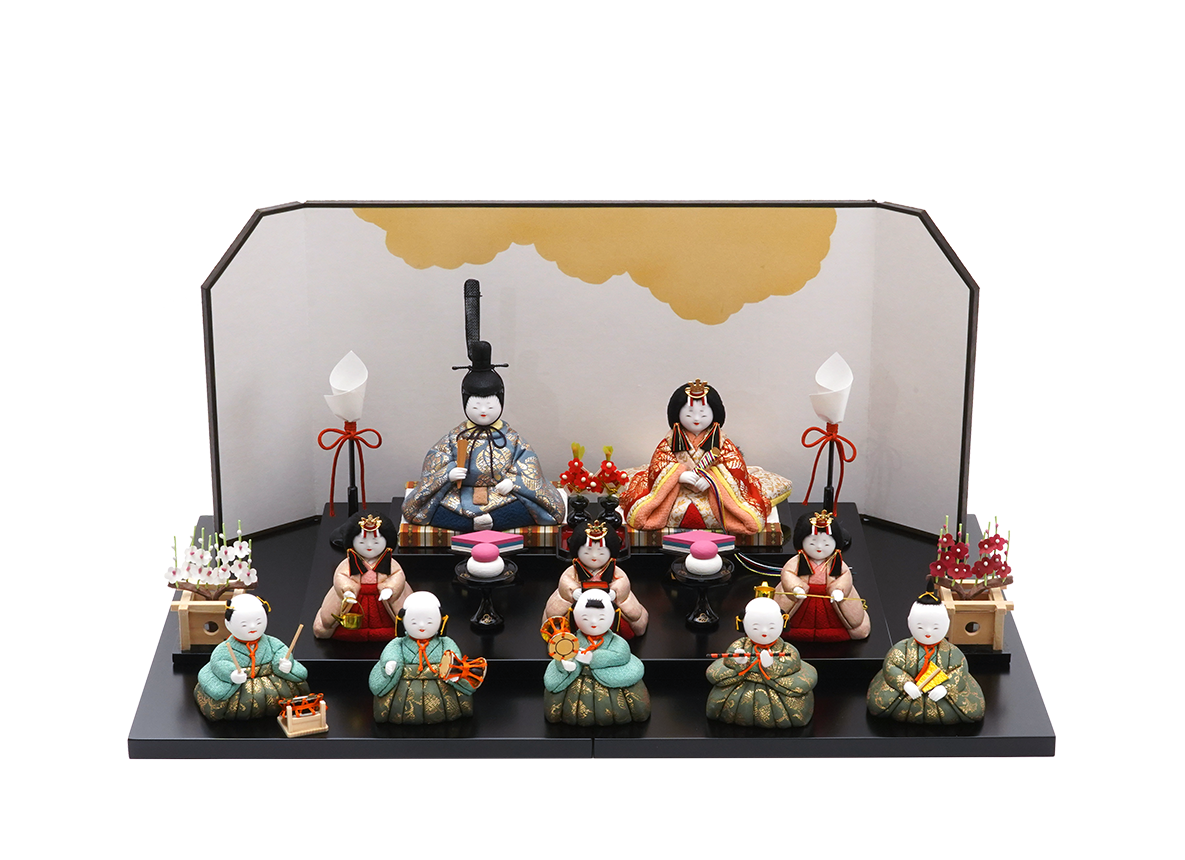 桃の節句の気分を盛り上げる五人囃子まで揃った十人のセットで、複雑な組み立てなどがなく、気軽にお飾りできる雛人形です。こちらのお人形の最大の見どころは、お殿様・お姫様から五人囃子に至るまで、十人ともに最高級織物・龍村裂(たつむらぎれ)のお衣装を身にまとっていることです。ツヤのある美しい布地には、遠き奈良〜平安時代にシルクロードから日本へ伝わった、ペルシャ風の草花模様をイメージさせる雅な柄を織り込み着せ付けました。上品で素敵なお衣装に合わせ、お顔立ちもただ幼いだけではない、柔らかみと気品の融合を大事にした五色・原孝洲が大切にする姿となりました。三人官女は、香り立つ品格の中に親王様へお仕えし、見護るにふさわしい慈愛で満ちています。三人の方々は独特のお道具を携えます。向かって右は「長柄銚子」(ながえのちょうし)、中央は「三方」(さんぽう)を、左には「加銚子」(くわえのちょうし)を手にします。いずれも宮中でのおつとめや行事に由来し、雛人形の華やかでいながら厳かな雰囲気を増します。五人囃子は、他ではなかなか見ることのできない昔の子供の髪型を再現しているのがとても人気です。向かって右より、謡(うたい)、笛、小鼓(こつづみ)、大鼓(おおつづみ)、太鼓(たいこ)の順で、宴にふさわしい華やぎで、お子さまを笑顔にするようなそんな作品です。薄く平たい台を重ねて段にし、選べる屏風を立ててお飾りいただくセットです。お子様の成長を末長く見守るにふさわしい堂々としたお雛さまです。