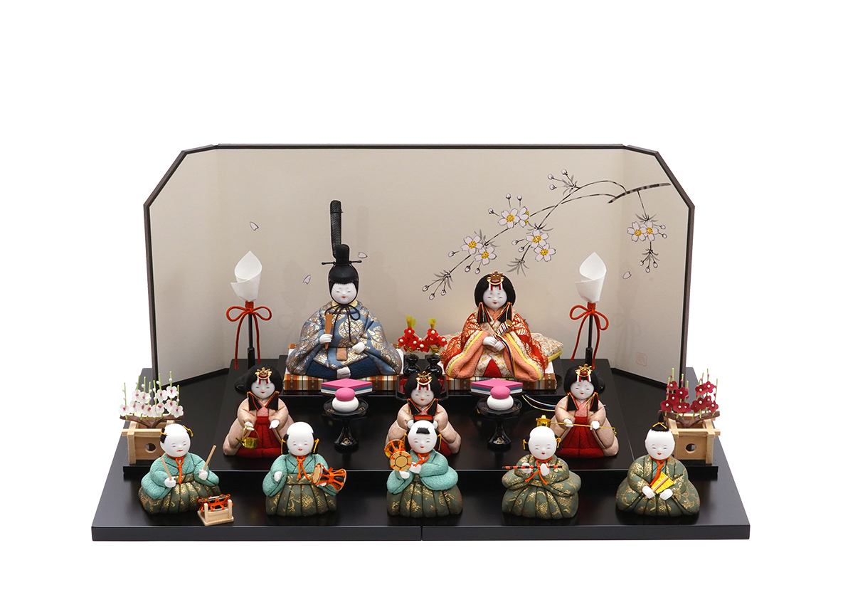 桃の節句の気分を盛り上げる五人囃子まで揃った十人のセットで、複雑な組み立てなどがなく、気軽にお飾りできる雛人形です。こちらのお人形の最大の見どころは、お殿様・お姫様から五人囃子に至るまで、十人ともに最高級織物・龍村裂(たつむらぎれ)のお衣装を身にまとっていることです。ツヤのある美しい布地には、遠き奈良〜平安時代にシルクロードから日本へ伝わった、ペルシャ風の草花模様をイメージさせる雅な柄を織り込み着せ付けました。上品で素敵なお衣装に合わせ、お顔立ちもただ幼いだけではない、柔らかみと気品の融合を大事にした五色・原孝洲が大切にする姿となりました。三人官女は、香り立つ品格の中に親王様へお仕えし、見護るにふさわしい慈愛で満ちています。三人の方々は独特のお道具を携えます。向かって右は「長柄銚子」(ながえのちょうし)、中央は「三方」(さんぽう)を、左には「加銚子」(くわえのちょうし)を手にします。いずれも宮中でのおつとめや行事に由来し、雛人形の華やかでいながら厳かな雰囲気を増します。五人囃子は、他ではなかなか見ることのできない昔の子供の髪型を再現しているのがとても人気です。向かって右より、謡(うたい)、笛、小鼓(こつづみ)、大鼓(おおつづみ)、太鼓(たいこ)の順で、宴にふさわしい華やぎで、お子さまを笑顔にするようなそんな作品です。薄く平たい台を重ねて段にし、選べる屏風を立ててお飾りいただくセットです。お子様の成長を末長く見守るにふさわしい堂々としたお雛さまです。