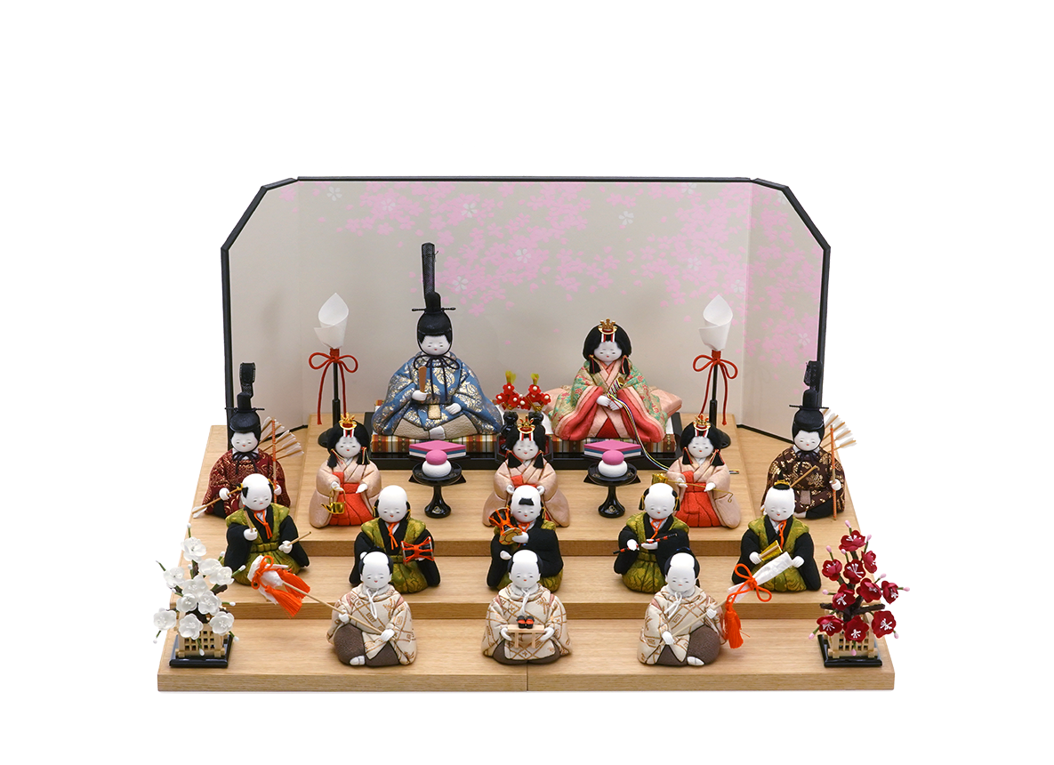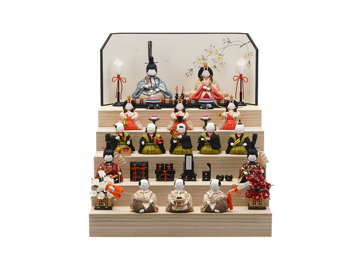 コンパクトな世界に美しく花開く美しい雛人形は、五色・原孝洲の自信作です。こちらのお人形の最大の特徴は、豪華にも本金箔を使った蒔絵の技法(手描きで衣装の上から直接描く)で絵柄を施したことです。桃の節句の春らしい気分が嬉しい梅、繁栄を示す松や竹の縁起柄をお衣装いっぱいに盛り込みました。肩口から袖へ流れるラインの美しさも魅力で、お姫様の袂(たもと)のなめらかさ、十二単を着重ねたような、ふくらみを感じる点も見応えがあります。同様にお殿様も後背部に下襲の裾(したがさねのきょ)と呼ばれる部分まで再現し、写実的かつ、かわいらしく足を組んだ形まで繊細にお作りしております。お顔も体とのバランスに合わせ、上品で麗しい、しかしどこかに幼さを残した、五色・原孝洲独特であり、大切にしているお姿となりました。ふんわりと空気をまとったように贅沢に結われた髪型は、多くの絹糸を丁寧にまとめあげて仕上げており、額の生え際まで筆で丁寧に描きこむことで、特徴あるお顔がもつ優美さを引き立てます。殿姫と一緒にお子様を見守る三人官女は、お殿様・お姫様の雰囲気に合わせた特別な作品です。三人官女が揃うことで、かわいいだけでは終わらない、伝えるべき日本の美しい伝統がこの場へ立ち現れます。衣装が映える黒塗りの飾り段は組み立て不要で、格調高い上品な金屏風をのせてお飾り頂くセットです。段飾りになっていることで、殿姫・三人官女が立体的に美しく見えます。待ちに待ったひな祭りを末永くお楽しみいただける雛人形です。