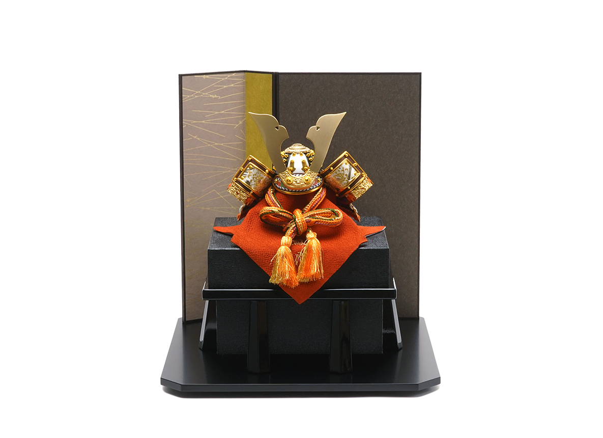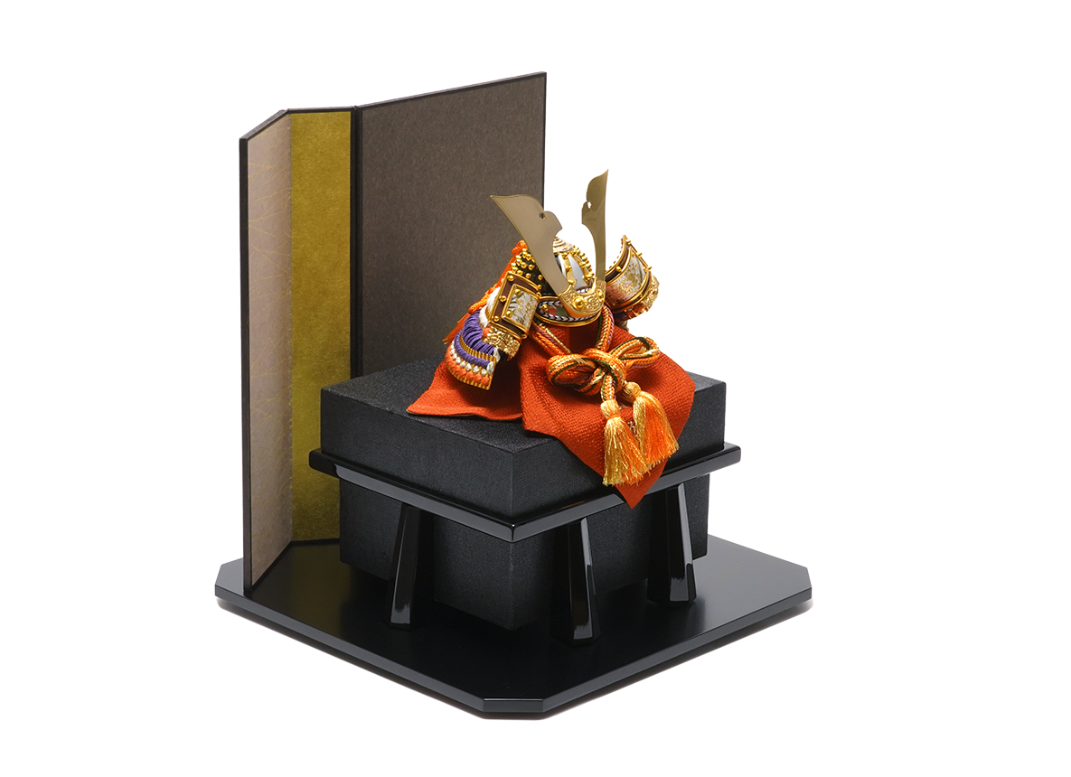 主役の兜(かぶと)が最も美しく映えるフォーマルなスタイルでご用意いたしました。兜そのものは、背面の色遣いが美しく、それら数種の色糸を用いることは熟練の技術と時間を要する特別な作品です。吹き返しと呼ばれる正面の耳部分にも柄が入っているのが人気のポイント。兜本体の収納は飾って載せる黒い箱に簡単に収まります。すっきりとした黒い台に、たくましい生命力を象徴する松葉柄の屏風をたててお飾りいただく五月飾りです。端午のお節句というハレの日にふさわしく、堂々とした兜飾りとなりました。