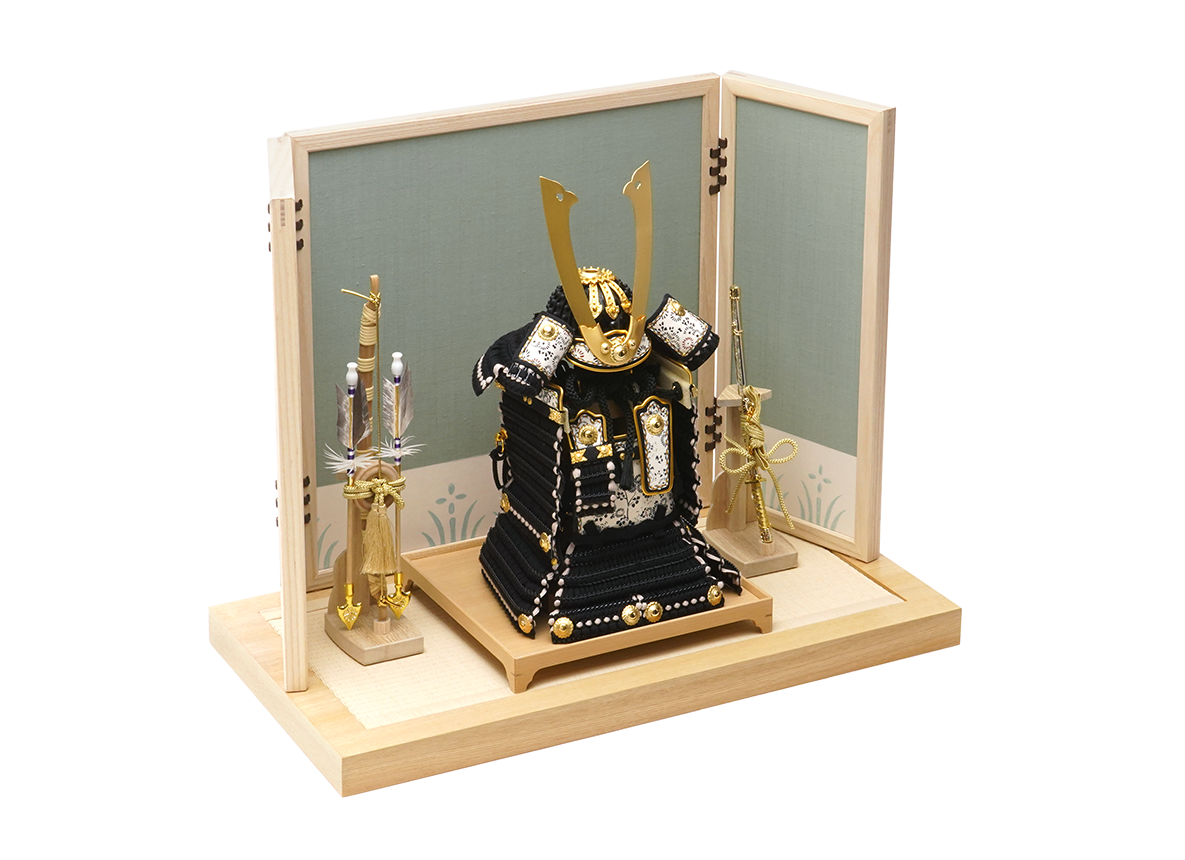 ※作札付きます。奉納鎧(ほうのうよろい:神社や博物館でよく見られる形です)という形式のため、スッキリと端正なお姿が特長です。長らく鎧飾りは、決まった色目の糸(濃い赤・緑・青など)が多く用いられてきましたが、こちらの作品では、現代の居住空間に合わせての創作を試みる五色・原孝洲の原裕子が、それまでの常識にとらわれない美しさを追求し、品格と格好良さを融合させた類を見ない五色オリジナルの自信作となりました。鎧の複雑な組み立てはなく、簡単にお飾りいただけます。淡い色合いで統一した飾り台・屏風・弓太刀付きのフルセットでご用意いたしました。端午の節句に末永くお飾りいただく大切な鎧は、現代の居住空間にも調和する、大好評の五月飾りです。